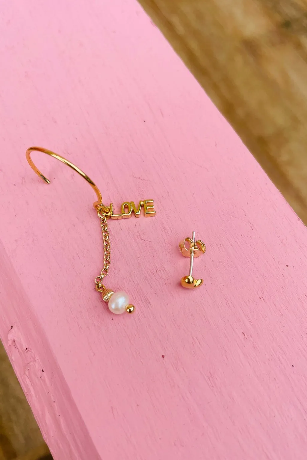Danskproducerede øreringe fra Friihof+Siig med et love-tag vedhæng og perledetalje. Smykket er fremstillet i forgyldt messing med en fin kædedetalje.
