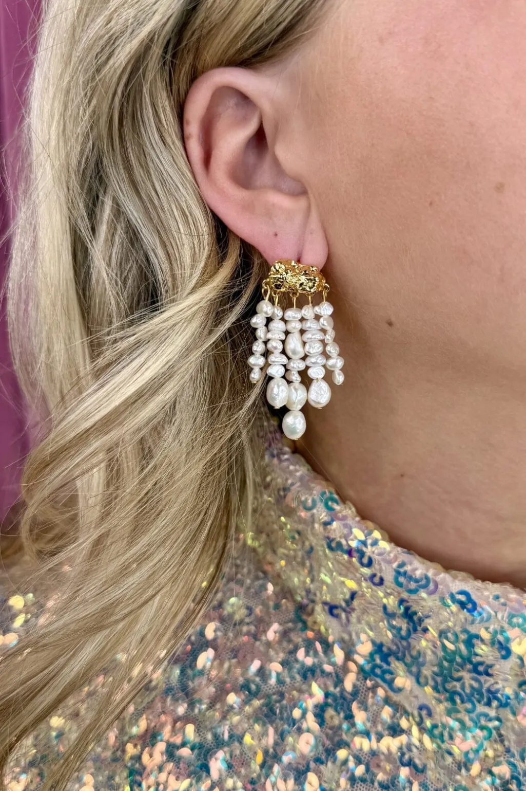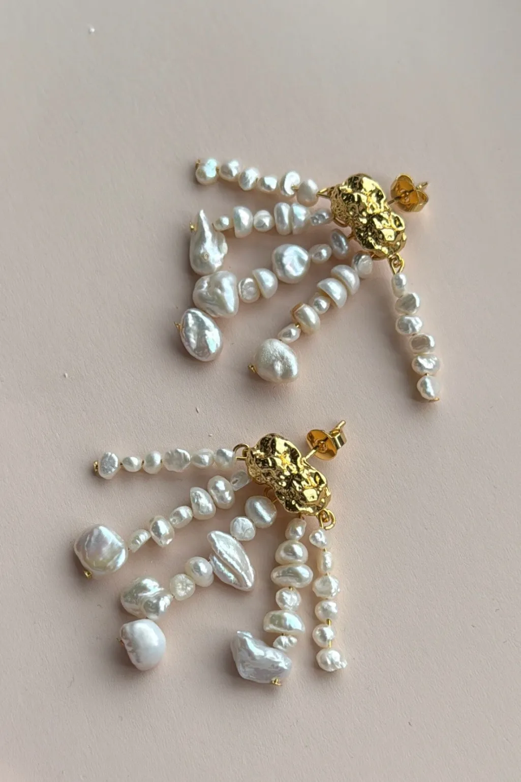 Forgyldte ørestik fra Mellow Moon med fem rækker af perler i forskellige størrelser. Den gyldne top kombineres med hvide og cremefarvede perler, der skaber en fin bevægelse.