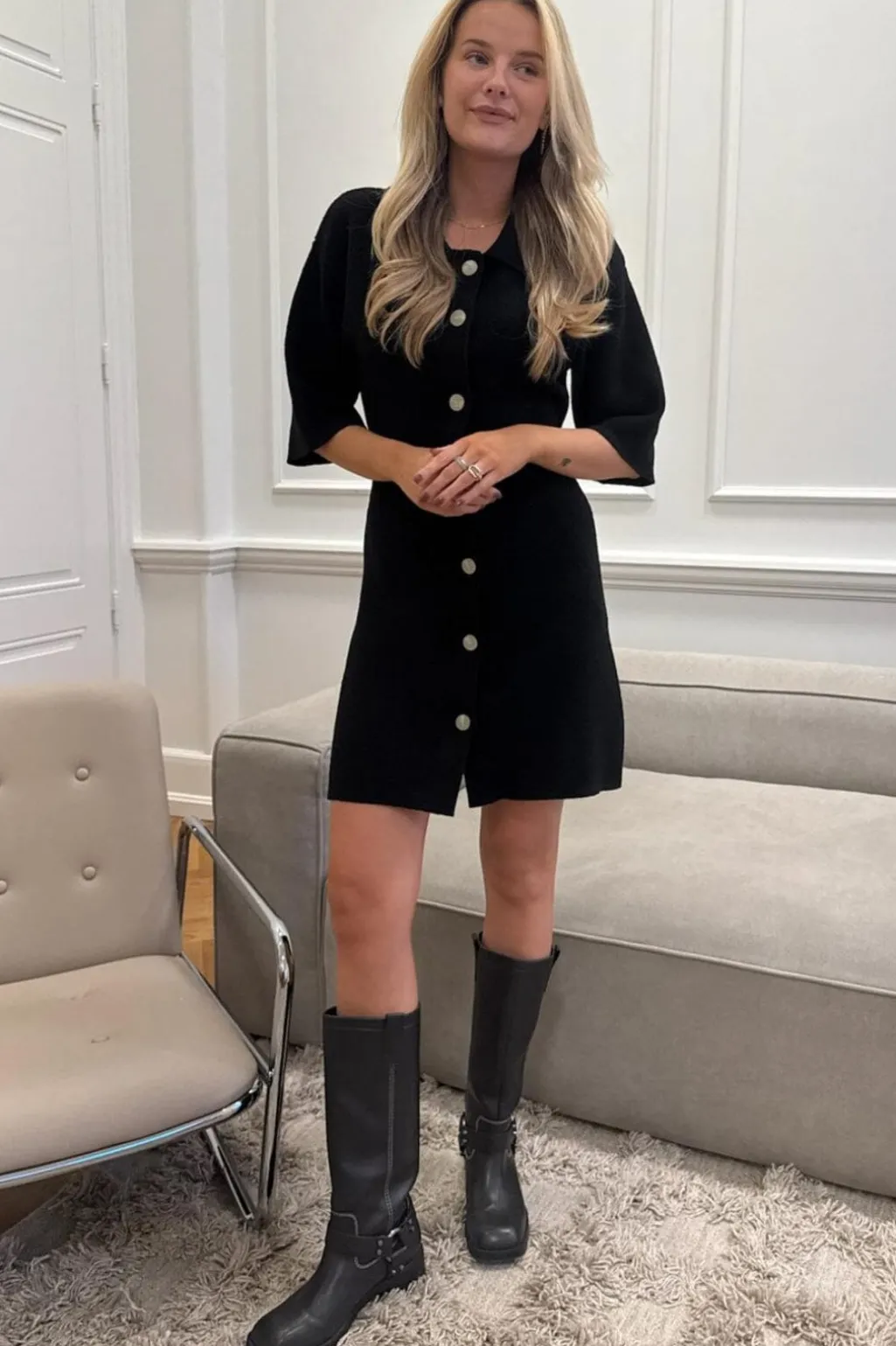 Sort strikkjole med korte, brede ærmer fra BYIC. Kjolen har en skjortekrave med lyse naturknapper hele vejen ned og perledetaljer, der giver en fin kontrast.