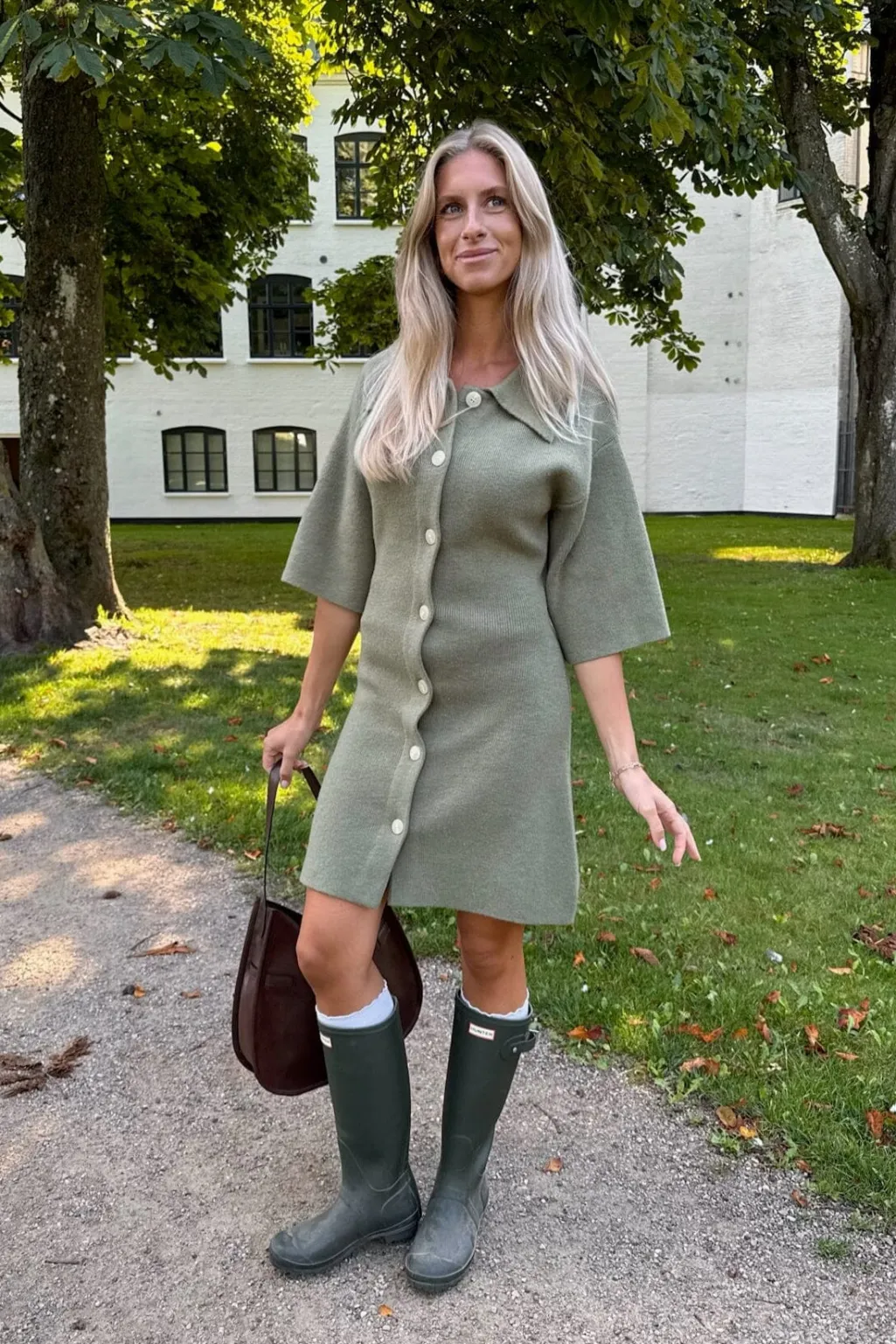 Armygrøn strikkjole fra BYIC x Molly&My, lavet af en blød uldblanding. Kjolen har knaplukning foran, skjortekrave og albuelange ærmer.