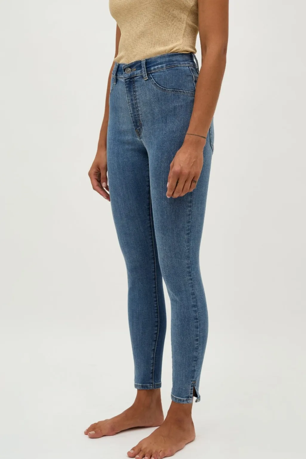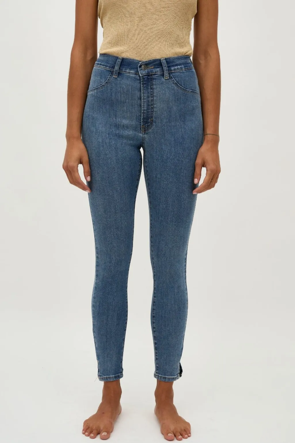 Jeans fra Global Funk i vintage lys blå. De har høj talje og regular fit med et klassisk fem-lomme design. Jeansene går til anklen og lukkes med knap og lynlås.