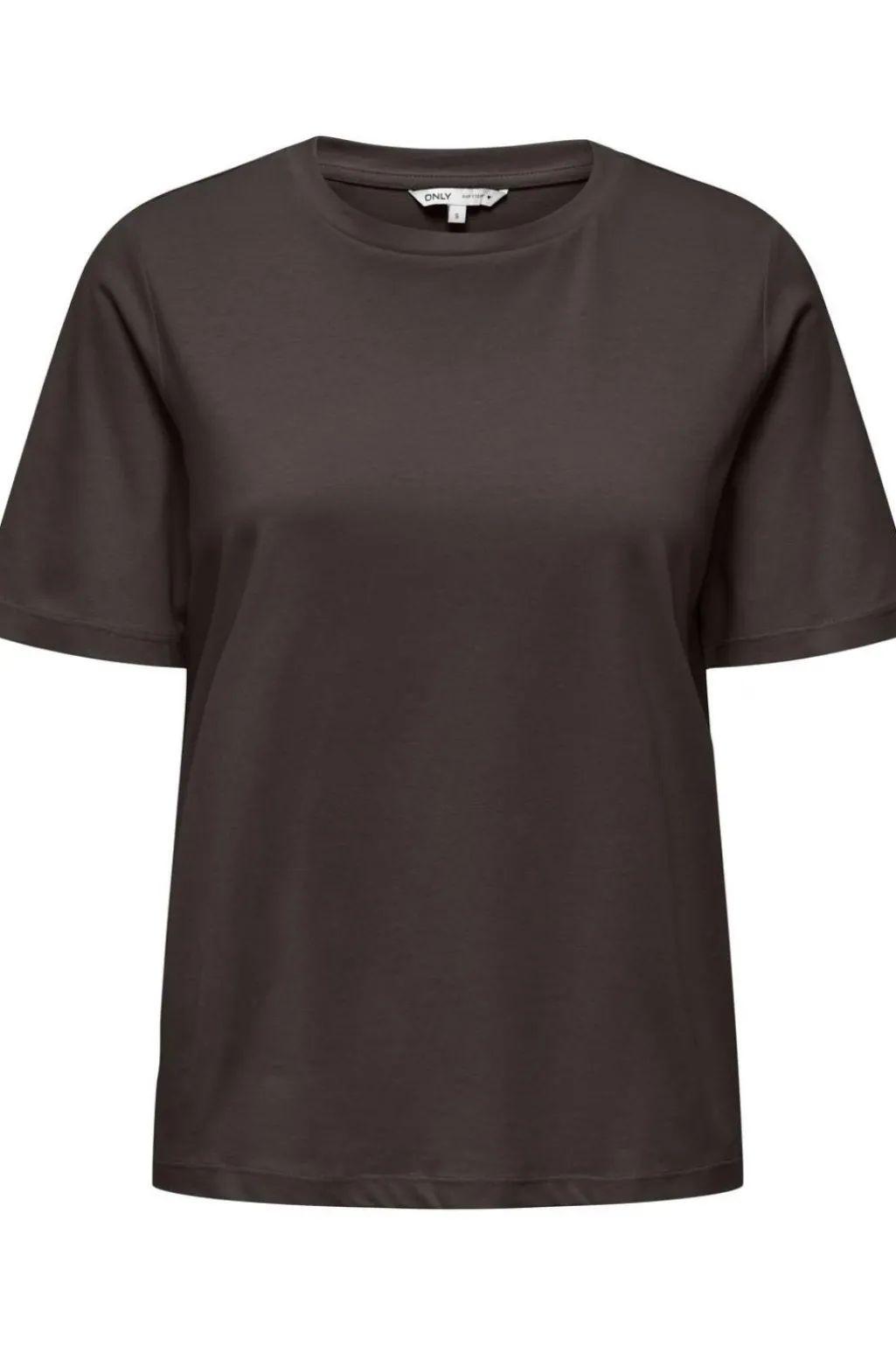 T-shirt fra Only i mørkebrun Chocolate Torte-farve. Den har korte ærmer og en rund halsudskæring med en regular fit-pasform, der giver god bevægelsesfrihed.