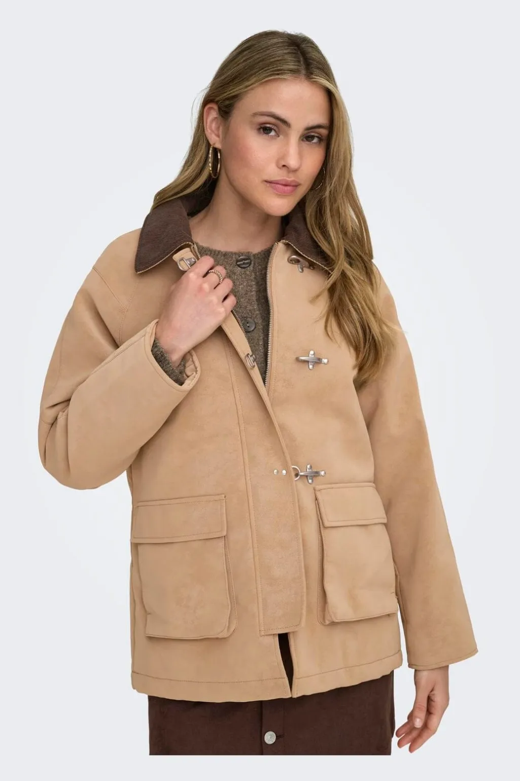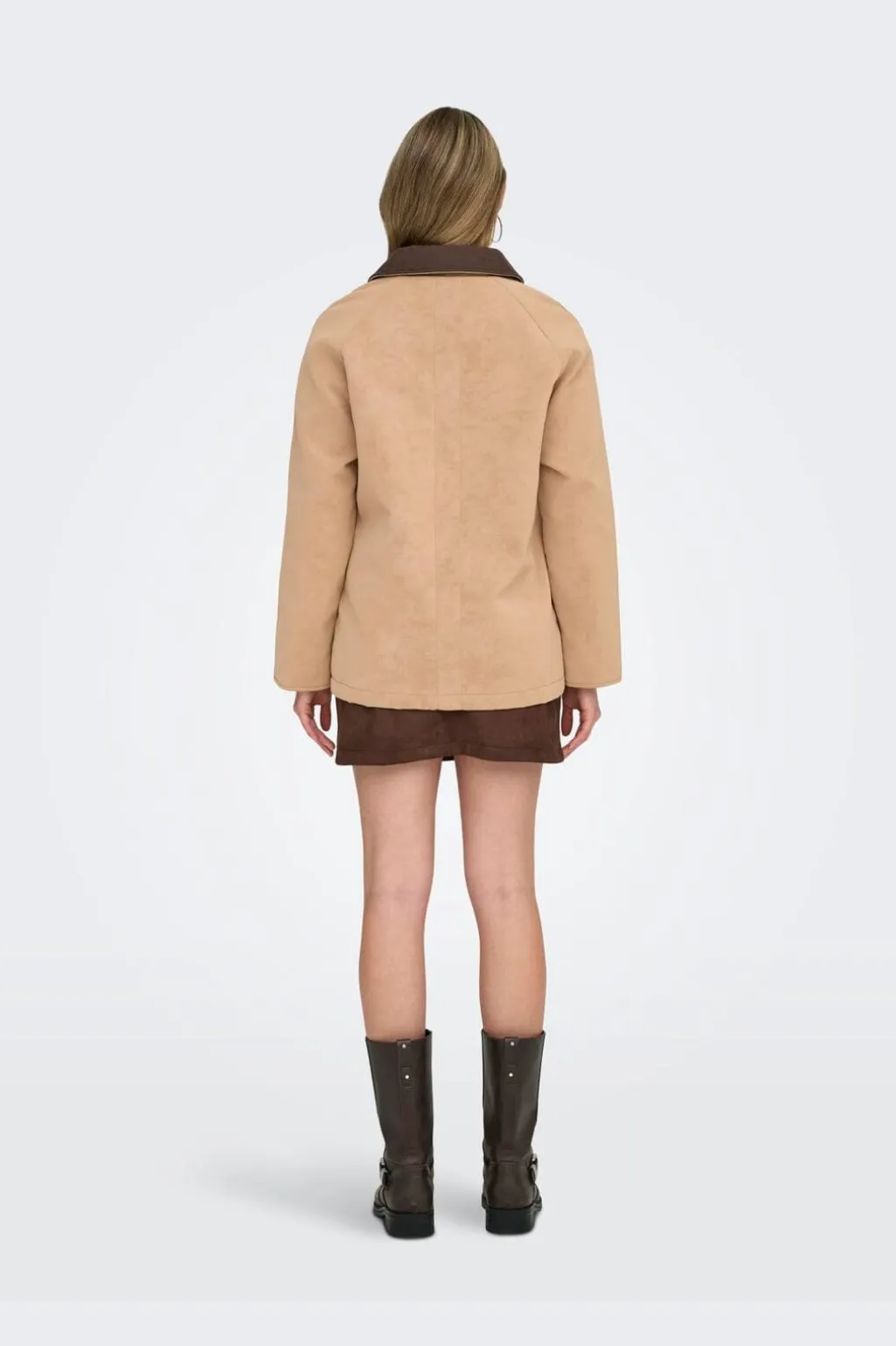 Ruskindsjakke fra Only i en varm beige-brun nuance. Jakken er lavet af genanvendt polyester med polyurethanbelægning og har en kontrastkrave i mørkere brun.