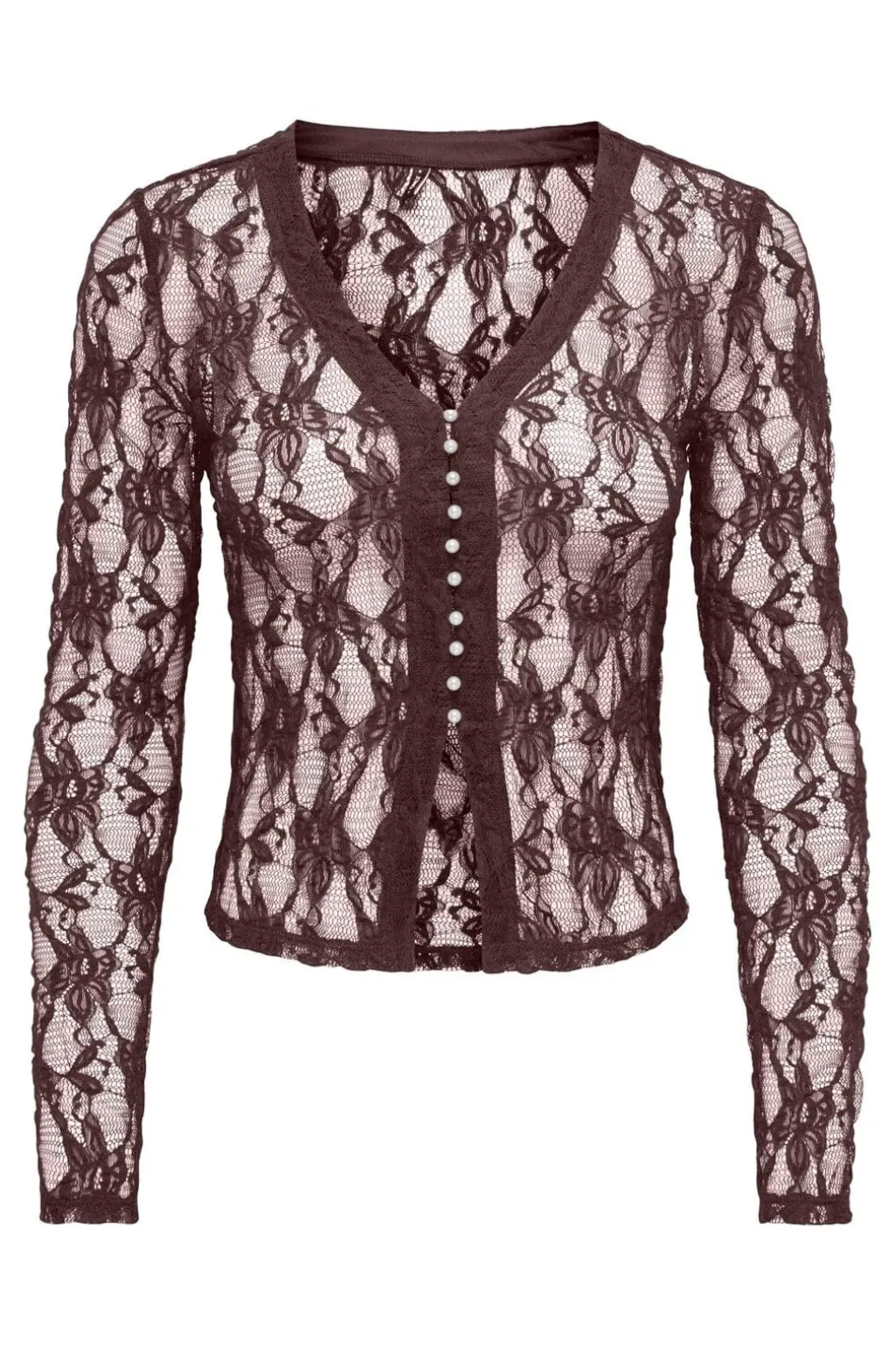 Langærmet top fra Only i gennemsigtigt blondemateriale med V-hals. Toppen er mørkebrun og har dekorative knapper med perledetaljer.
