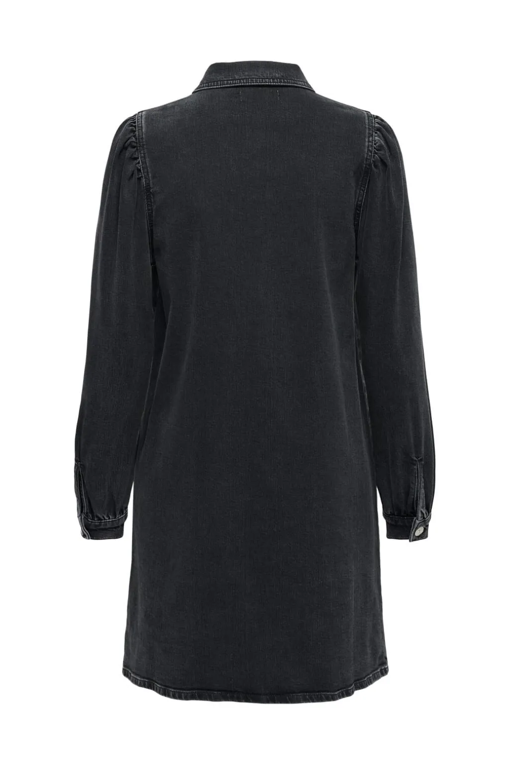 Denimkjole fra Only i vasket sort. Kjolen har skjortekrave, knaplukning foran og lange pufærmer med manchetter. Den ekstra korte længde giver et særegent udtryk.