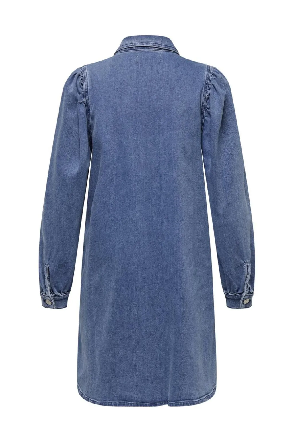 Denimkjole i medium blå med skjortekrave og knaplukning hele vejen ned. De lange pufærmer med manchetter giver kjolen et særligt præg, mens den regulære pasform sikrer god bevægelighed.