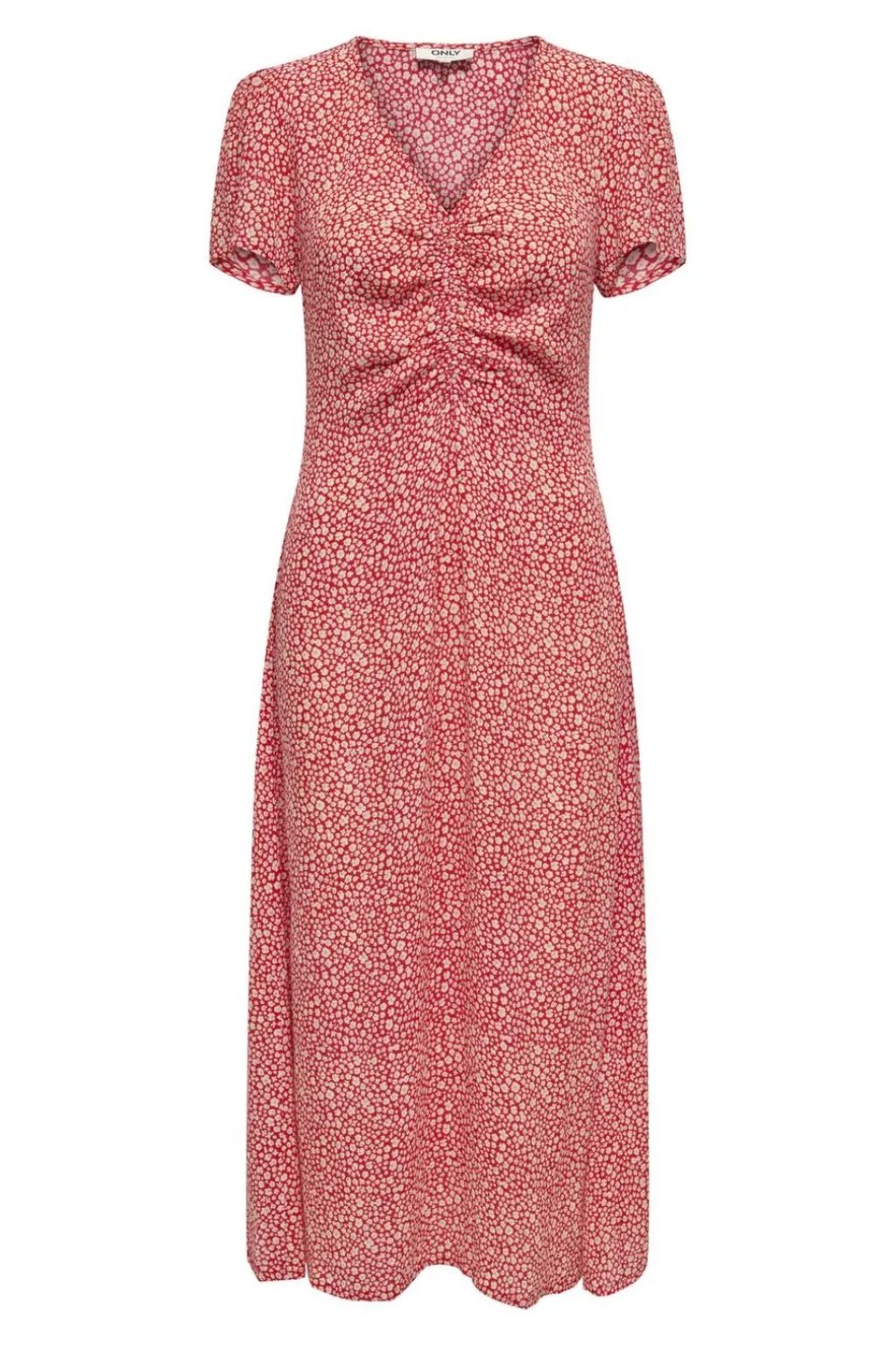 Rød kjole med hvidt blomsterprint fra Only. Kjolen har en v-halsudskæring og korte ballonærmer. Den falder til midt på læggen og har flæsedetaljer.