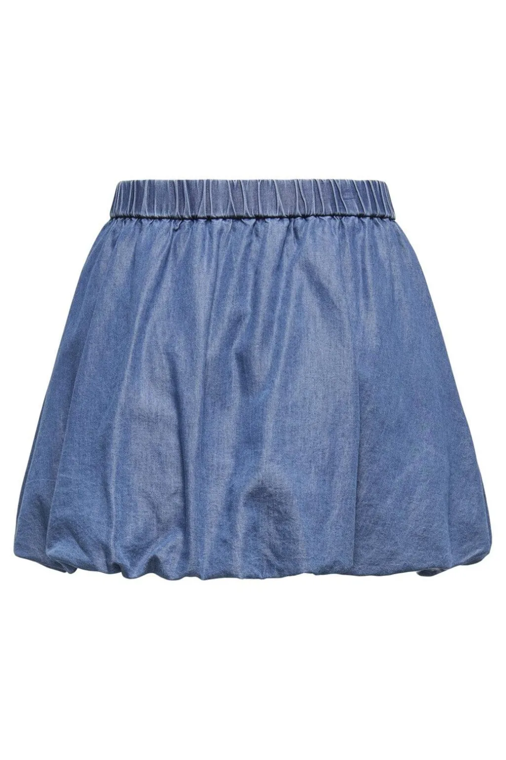 Denimnederdel fra Only med ballonform og elastisk linning. Den mediumblå denim giver nederdelen et klassisk udtryk, som er let at style.