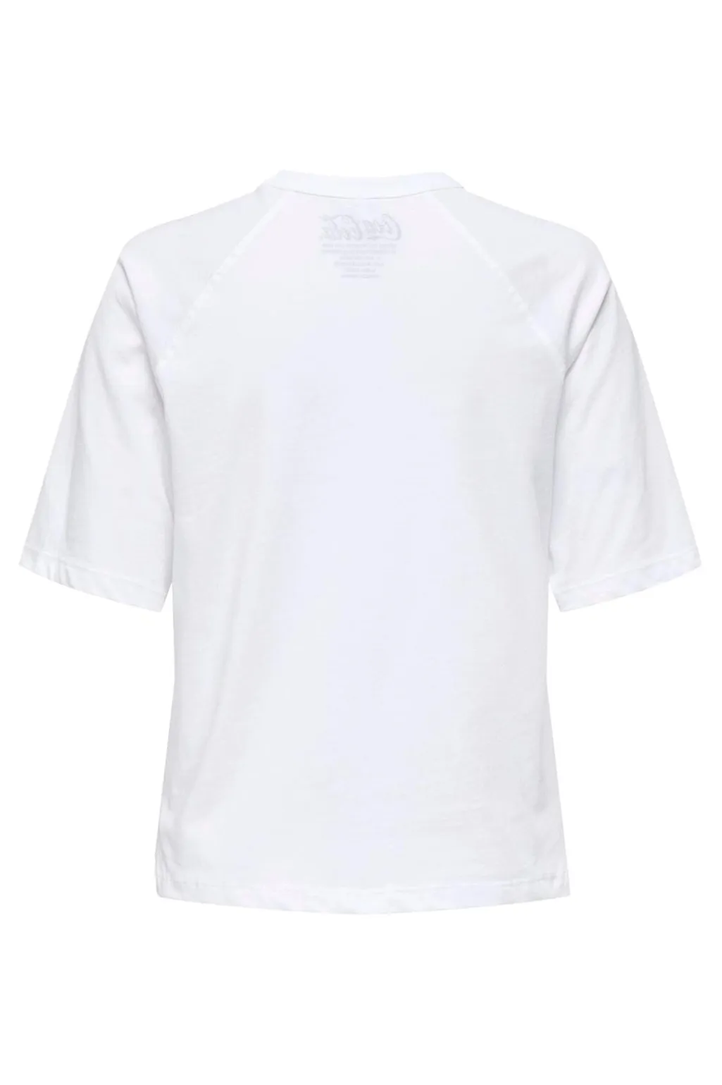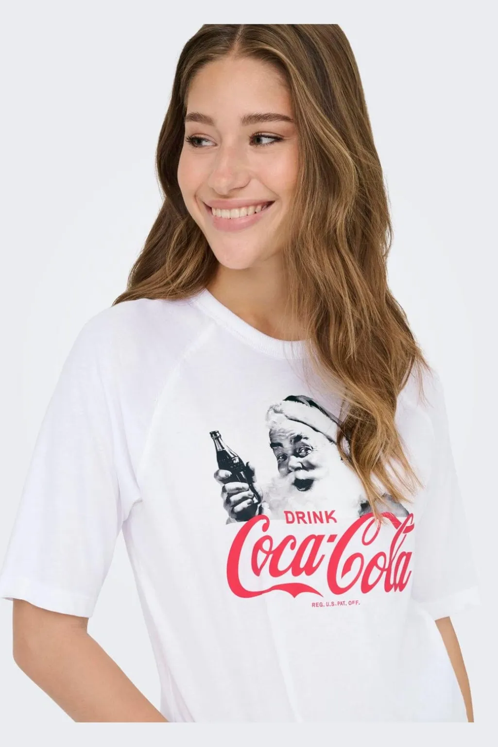 Hvid t-shirt fra Only med et nostalgisk Coca-Cola-julemotiv. T-shirten har en rund hals og et print af julemanden med en Coca-Cola-flaske på forsiden.