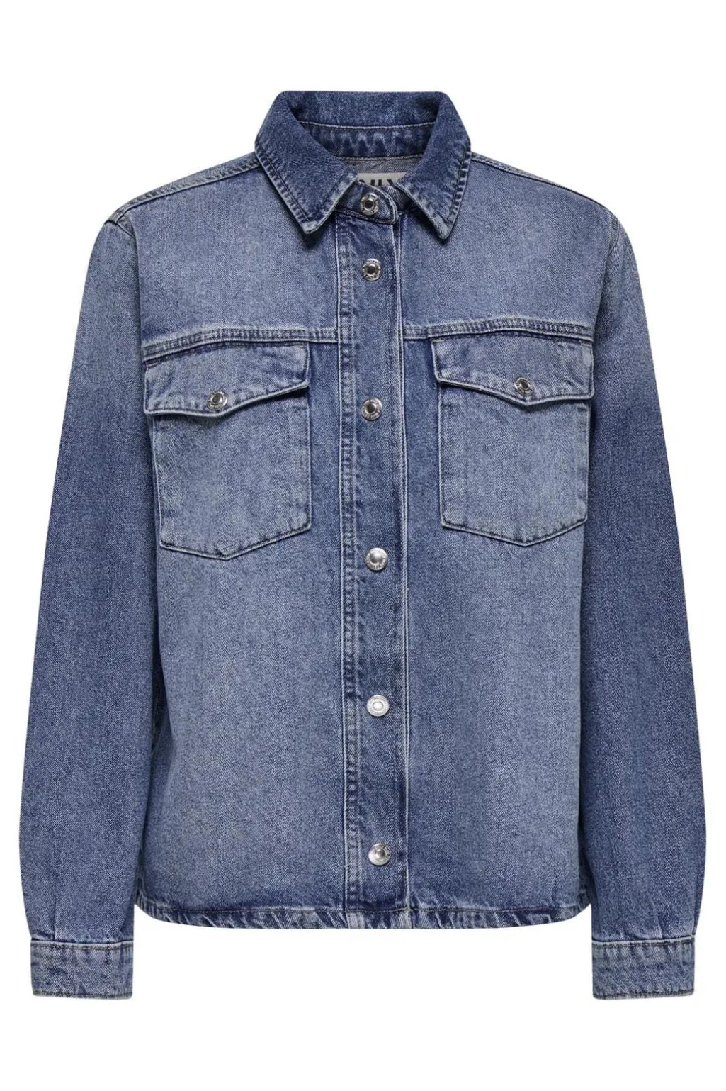 Denimskjorte fra Only i medium blå denim. Skjorten har skjortekrave, lange ærmer med knaplukkede manchetter og brystlommer. Knapper hele vejen ned foran.
