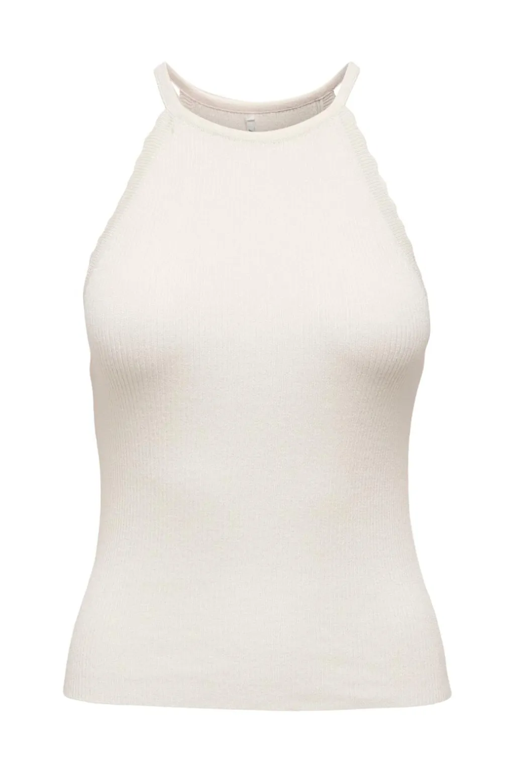 Strikket top fra Only i cremehvid Cloud Dancer-farve. Toppen har en ribbet tekstur og et halterneck-design med bølgede kanter. Den ærmeløse model har en lige pasform.