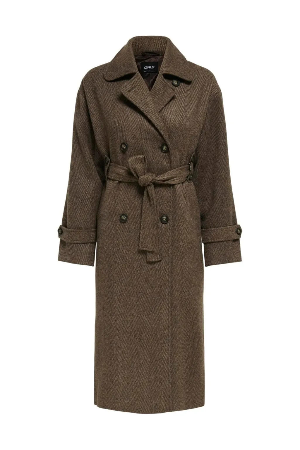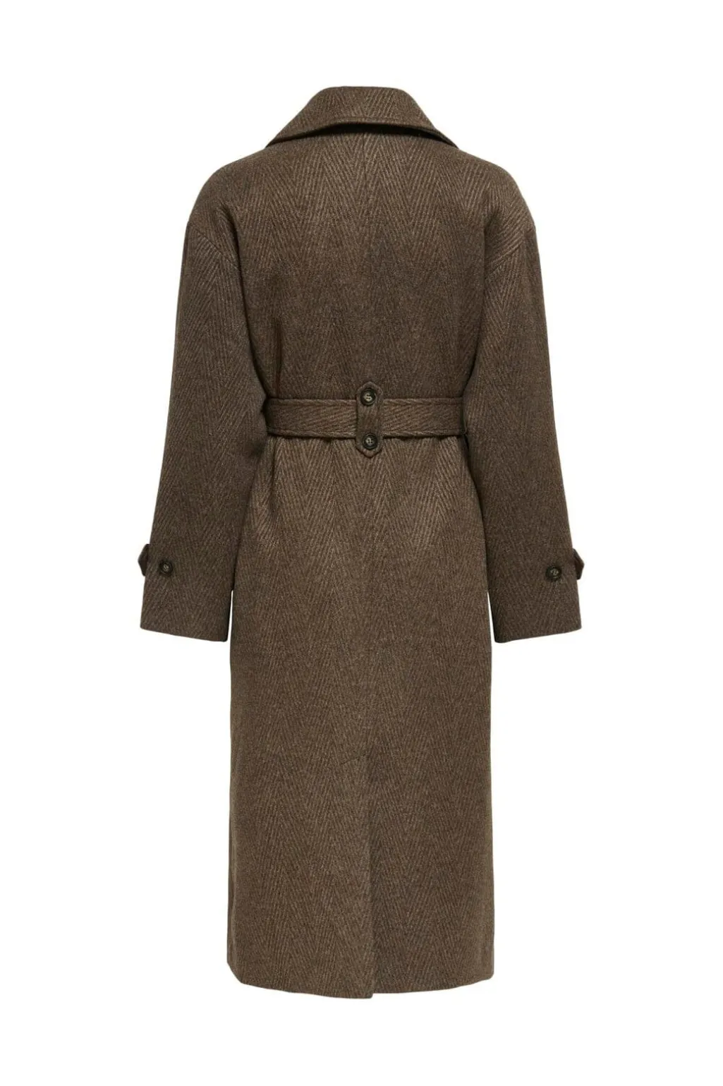 Brun frakke fra Only med sildebensmønster. Fremstillet af vævede materialer med revers halsudskæring, knapper foran og bælte i taljen. Ærmerne har justerbare kanter med knapper.