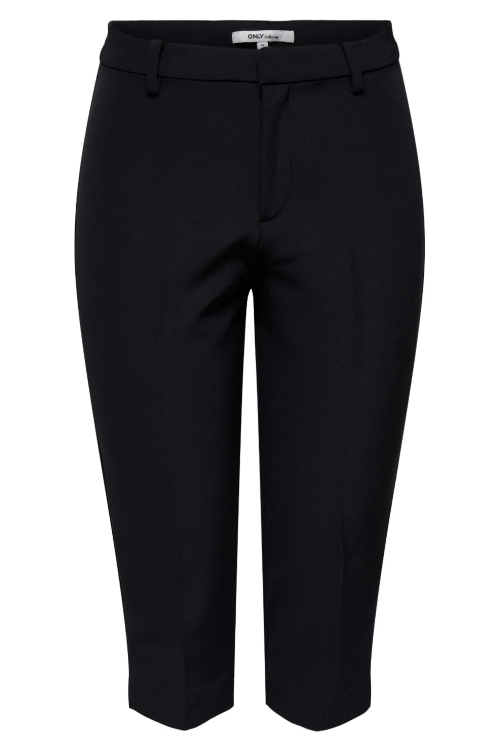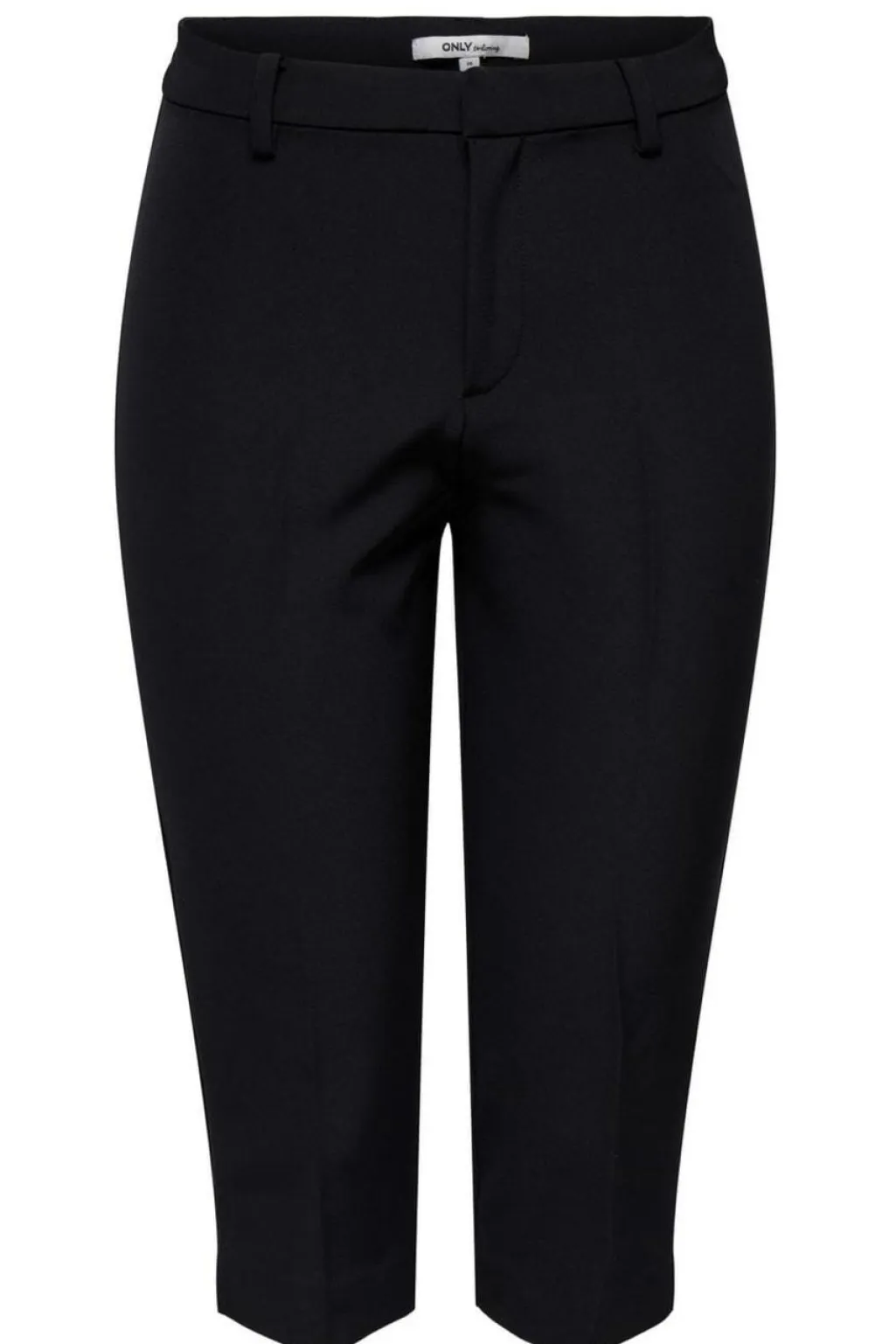 Sorte capri-bukser fra Only med slim fit og mellemhøj talje. Bukserne har en knælang model med bæltestropper samt lynlås- og knaplukning i gylpen.