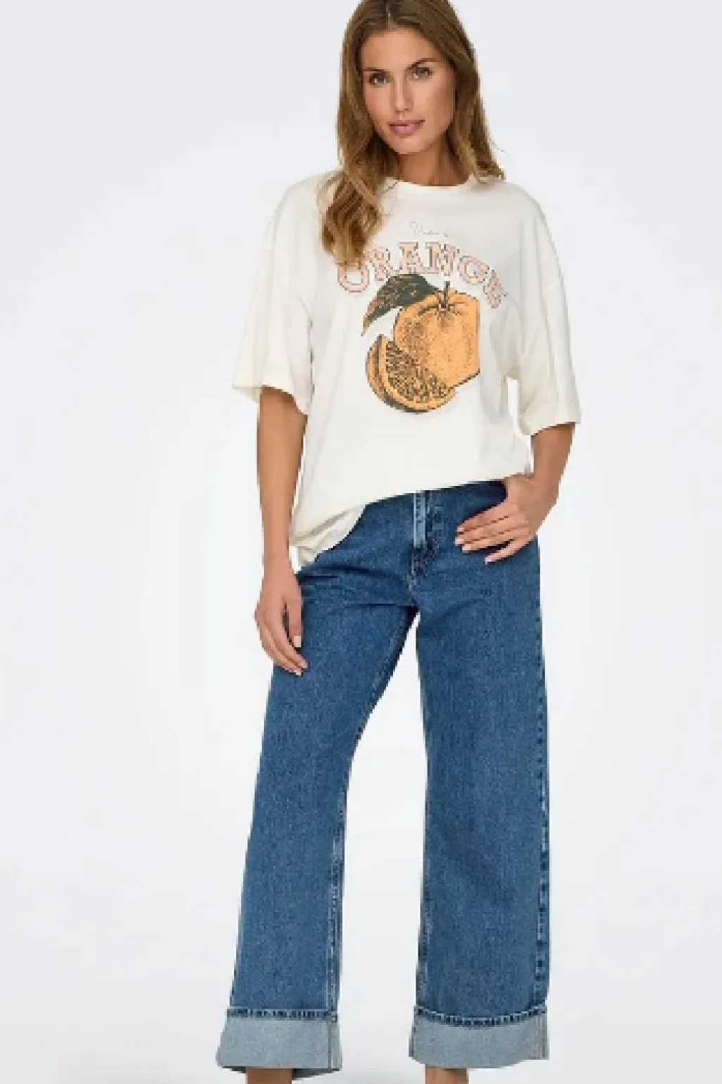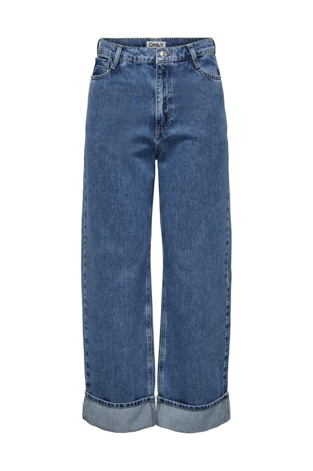 Jeans fra Only i medium blå denim med høj talje og vide ben. Bukserne har opsmøg forneden og lukkes med knapper i gylpen. De er udstyret med fem lommer og bæltestropper.