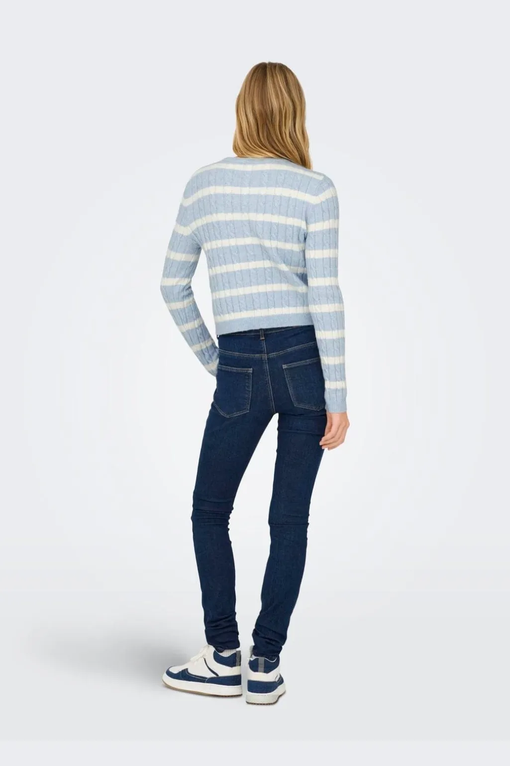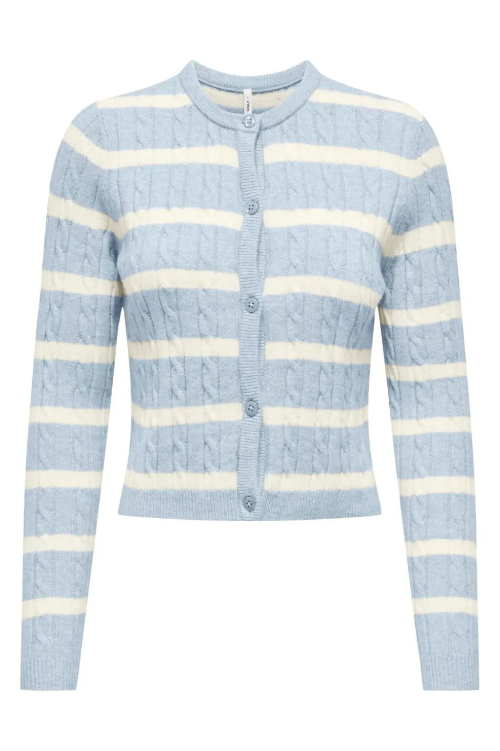 Strikket cardigan fra Only i lyseblå med hvide striber. Cardiganen har kabeldetaljer og knaplukning foran med matchende knapper.