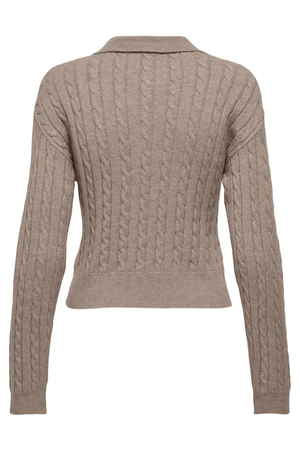 Strikket polo fra Only i en lys beige nuance med kabelmønster over hele trøjen og et lille rødt hjertebroderi på brystet.