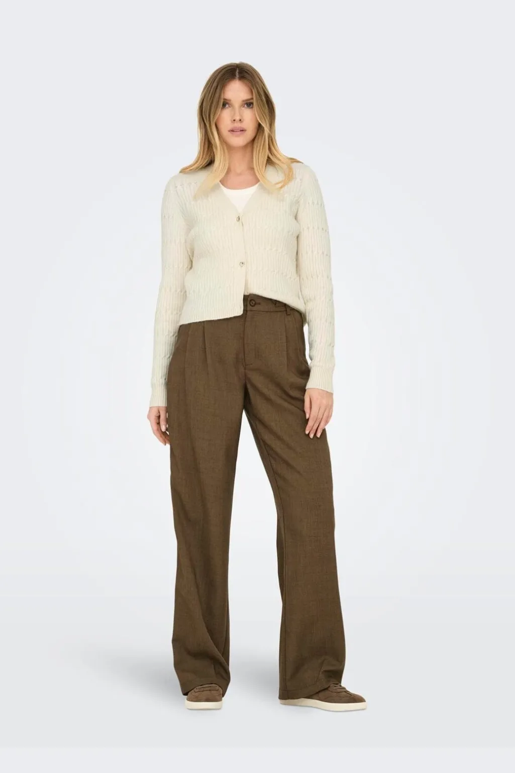 Lys grå meleret cardigan fra Only, lavet af en blanding af viskose, nylon og genanvendt polyester. Cardiganen har dekorative stikninger i strikmønsteret.