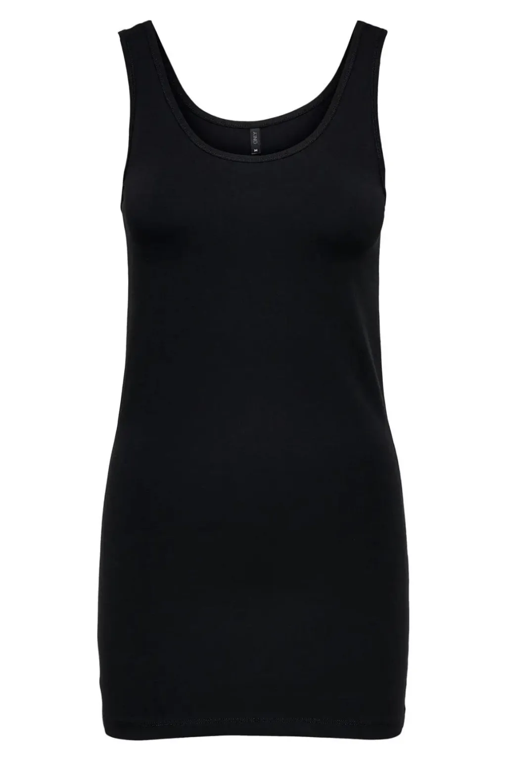 Sort tanktop fra Only med rund halsudskæring og ærmeløst design. Den kropsnære pasform og det enkle design gør den nem at style.