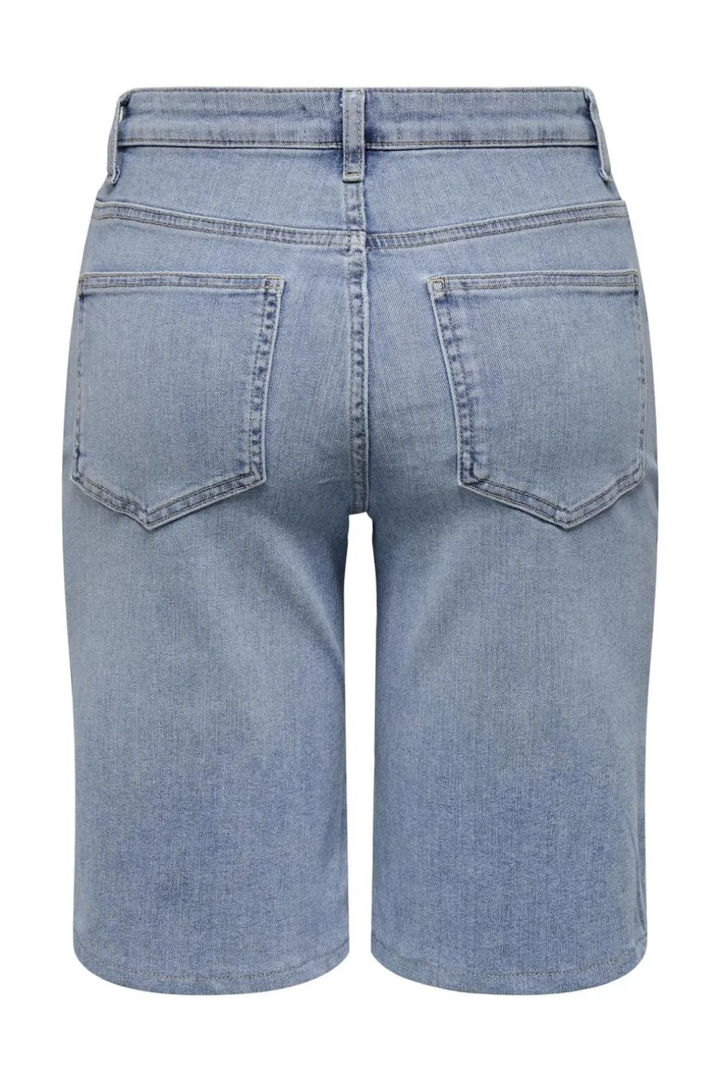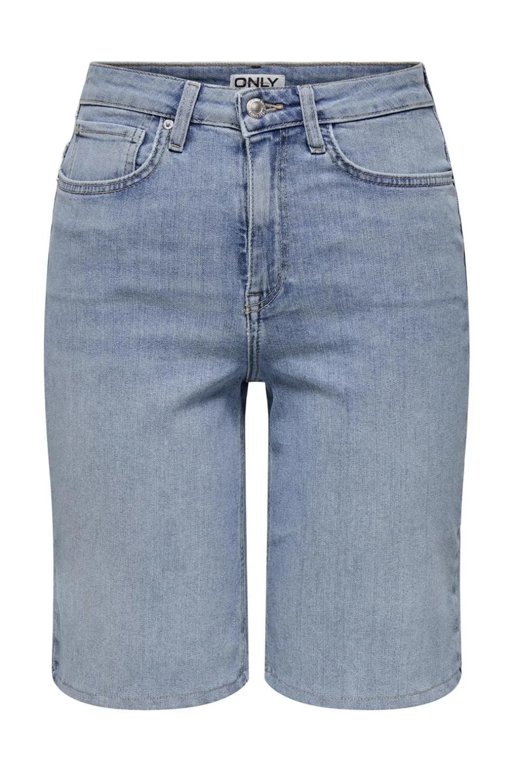 Lyseblå denimshorts fra Only med knælængde og høj talje. Shortsene har praktiske lommer både foran og bagpå samt en møntlomme. Den klassiske lukning består af både knap og lynlås.