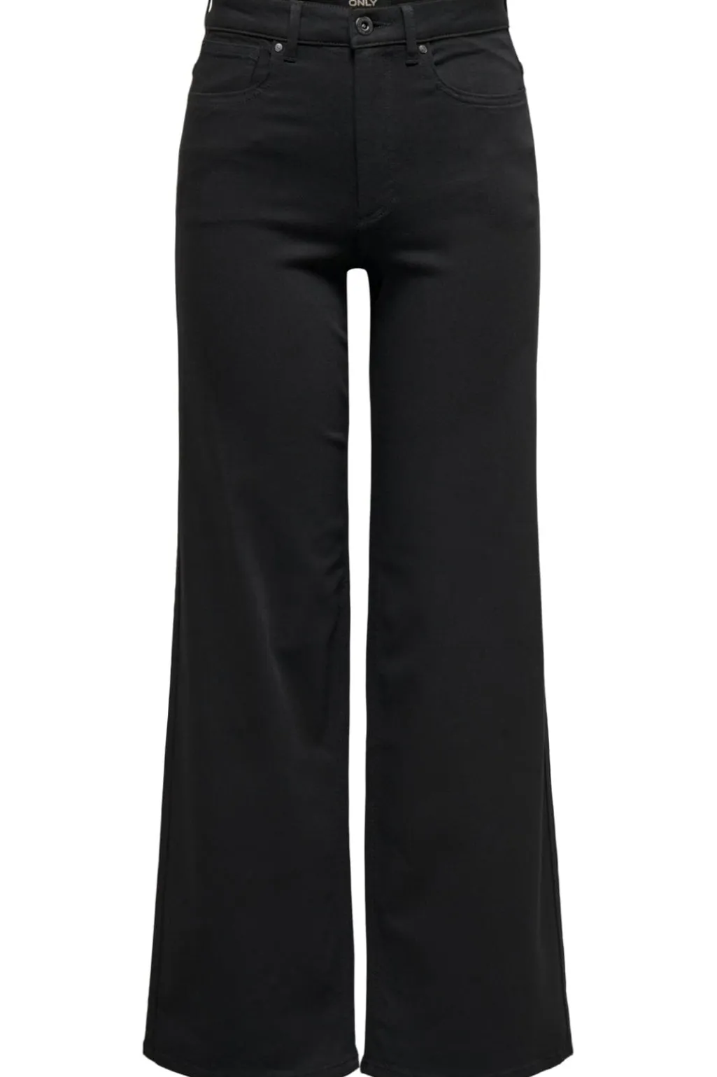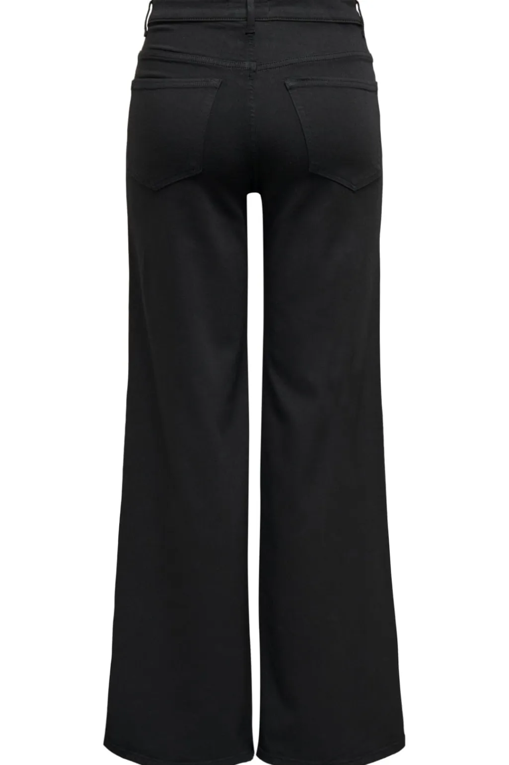 Sorte denimbukser fra Only med høj talje og brede ben. Bukserne har for- og baglommer samt bæltestropper i taljen og lukkes med lynlås i gylpen.