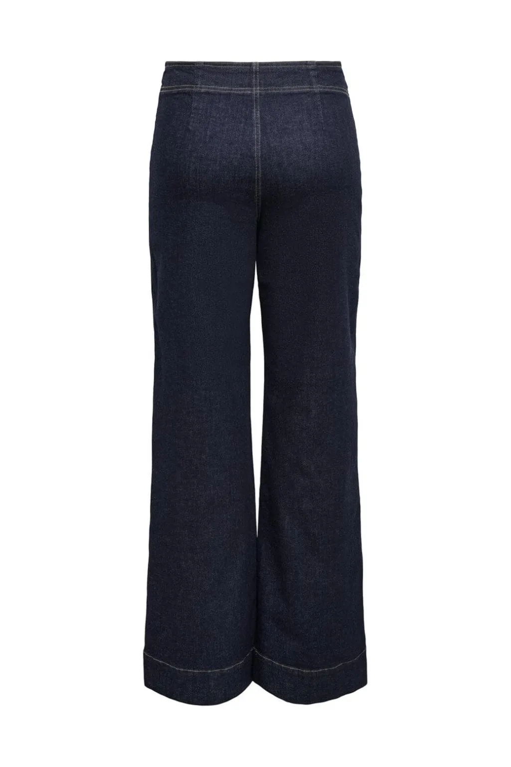 Mørkeblå jeans fra Only med vide ben og ankellængde. Bukserne har høj talje med dobbelt knaplukning og spænde i linningen.