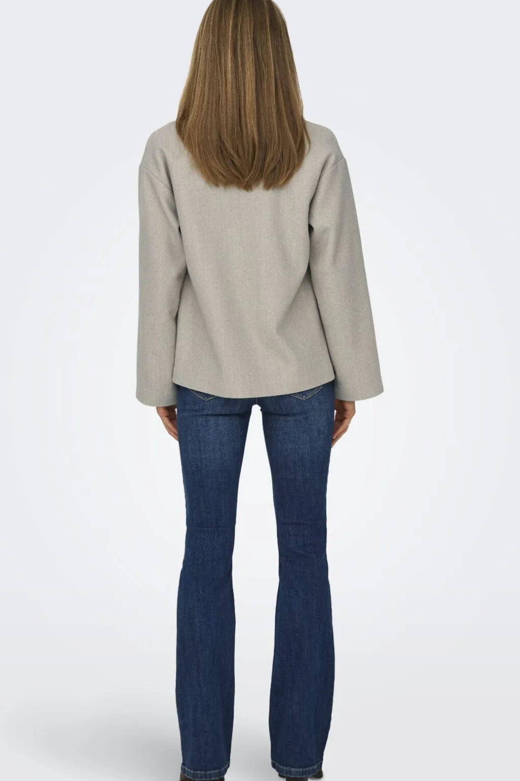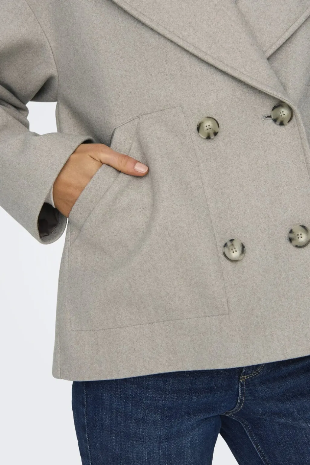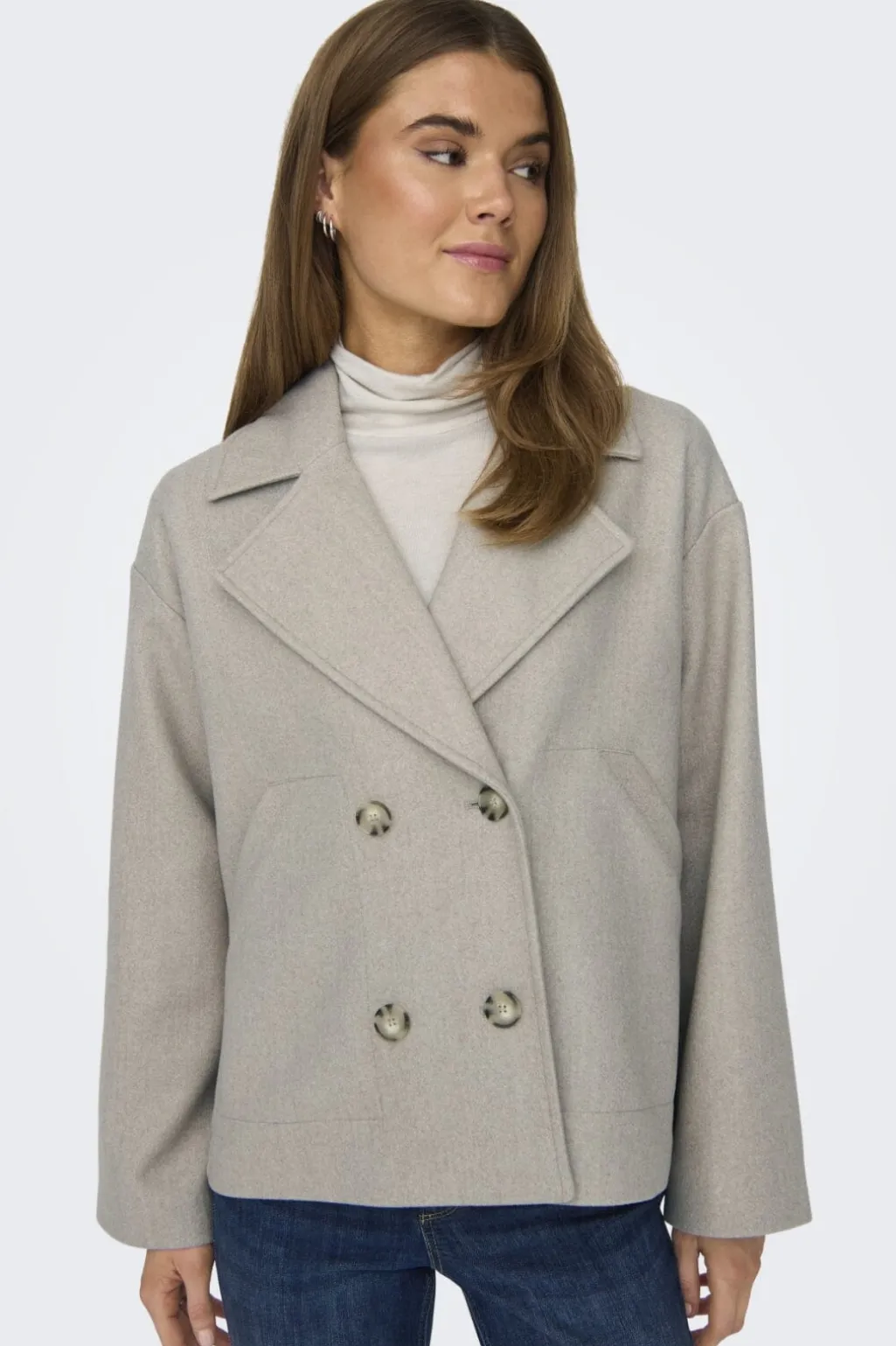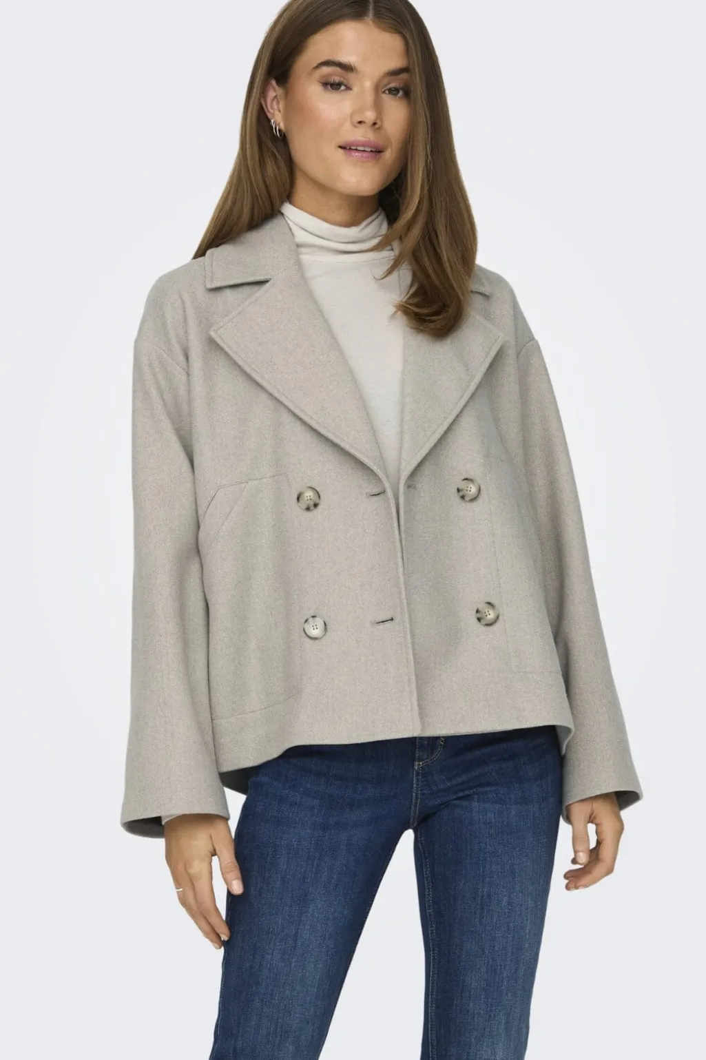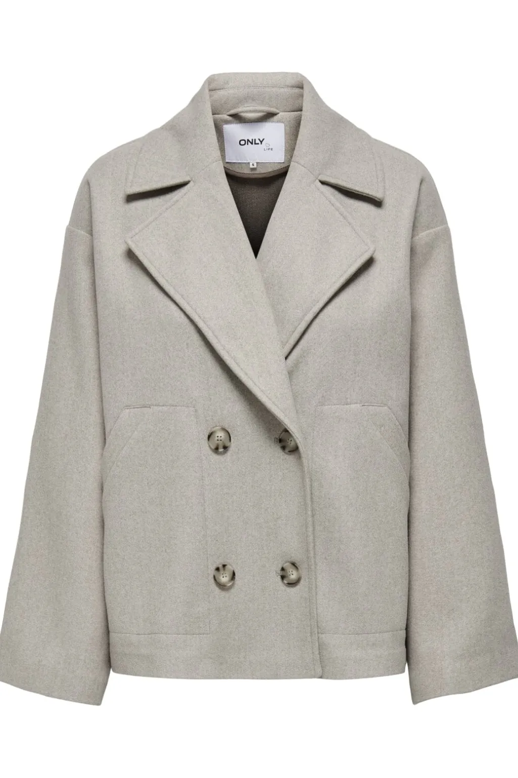 Jakke fra Only i beige-grå meleret nuance. Den har skjortekrave, dobbeltknapper og lange ærmer. Sidelommerne er placeret i en praktisk højde på jakken.