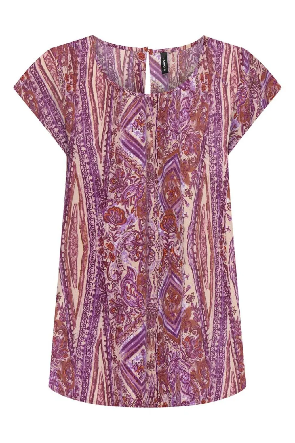 Mønstret top fra Only med et paisley-inspireret design i lilla, beige og cremehvide nuancer. Toppen har en rund halsudskæring og korte ærmer med knapdetaljer.