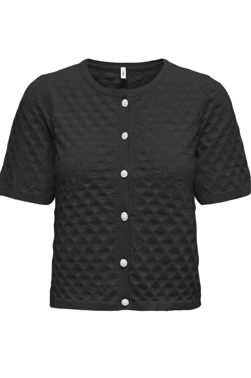 Sort cardigan fra Only med struktureret fladstrik. Den har rund hals, korte ærmer og perleknapper foran. Strikken har et design med mønstre og en regular fit.
