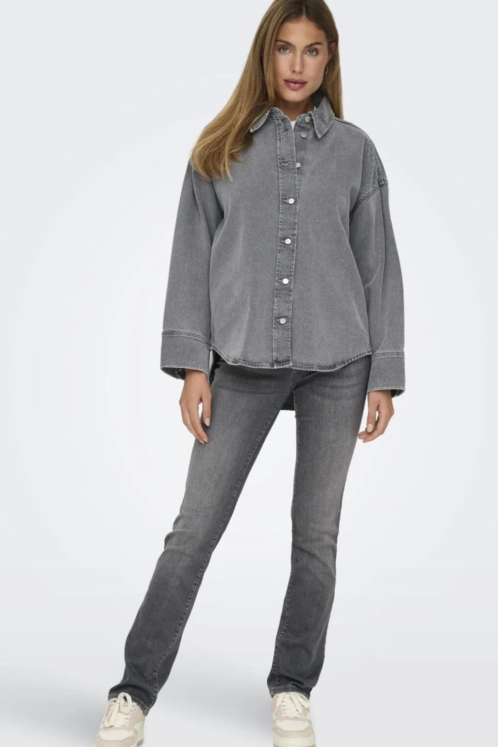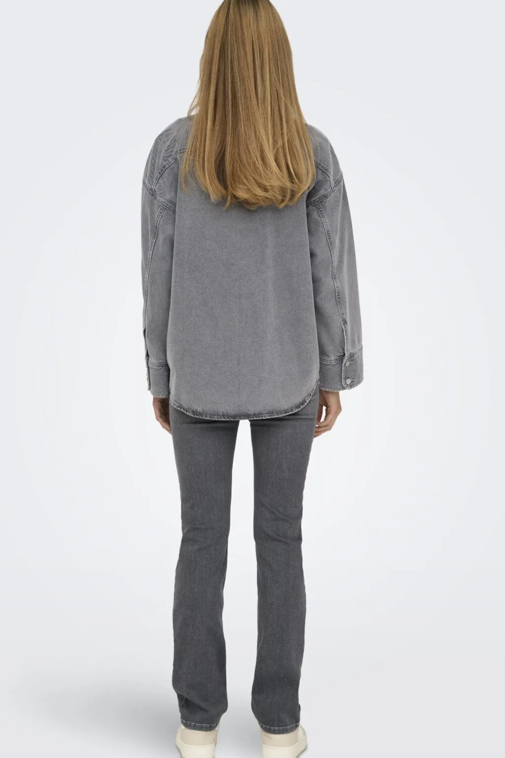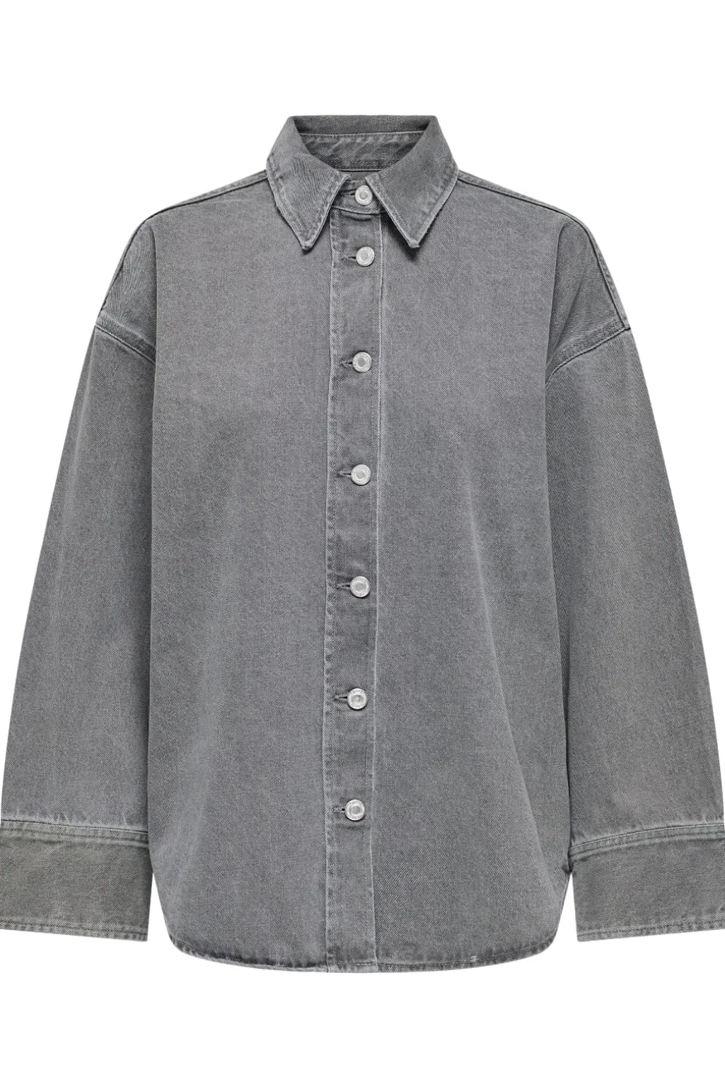 Mellemgrå denimjakke fra Only med oversized pasform. Jakken har skjortekrave og synlige knapper hele vejen ned. Denimstoffet har en karakteristisk diagonal ribstruktur.