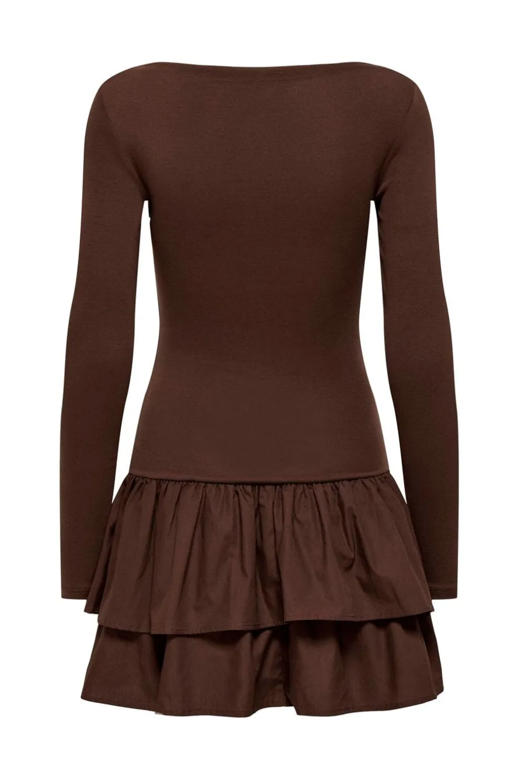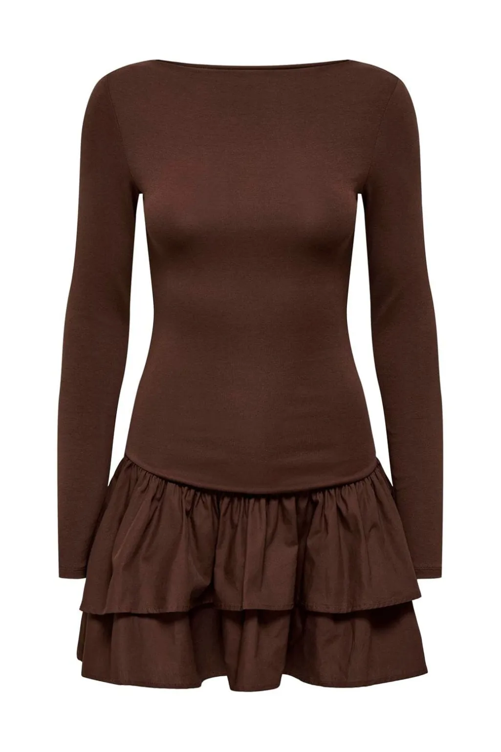 Brun kjole fra Only med bådudskæring og lange ærmer. Kjolen har en regular fit-pasform og en knælang nederdel med flæser og rynker i bunden.