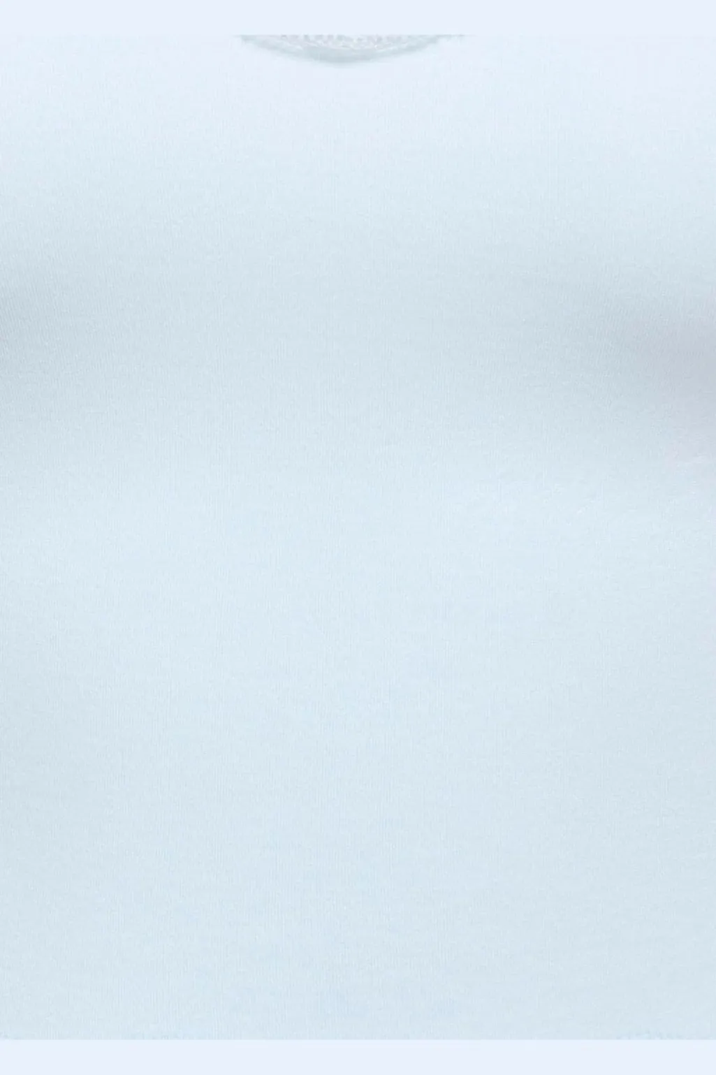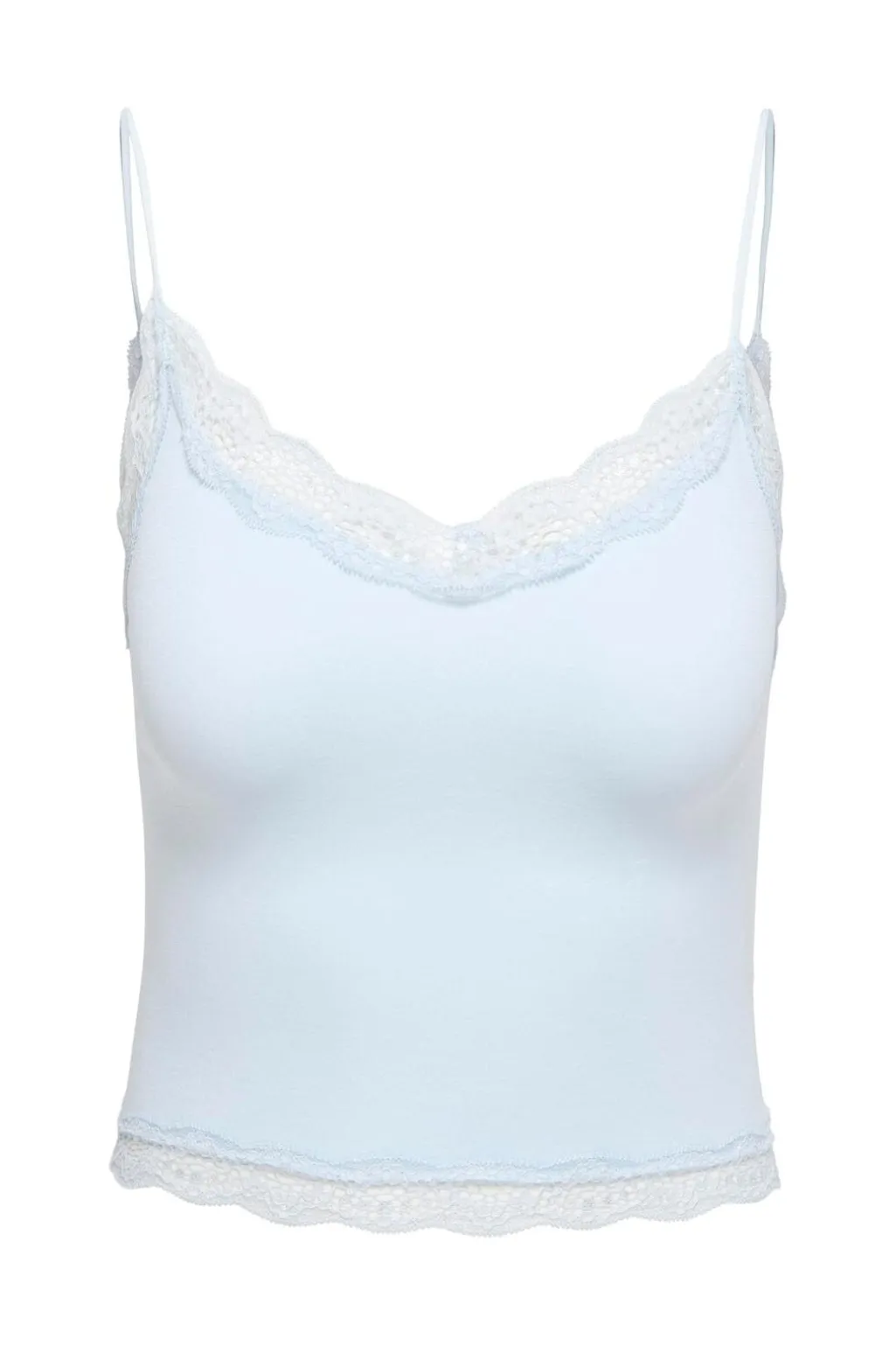 Lyseblå cropped top fra Only med blondedetaljer. Toppen har en v-udskæring med blondekant og tynde stropper. Det sømløse design giver en tætsiddende pasform.