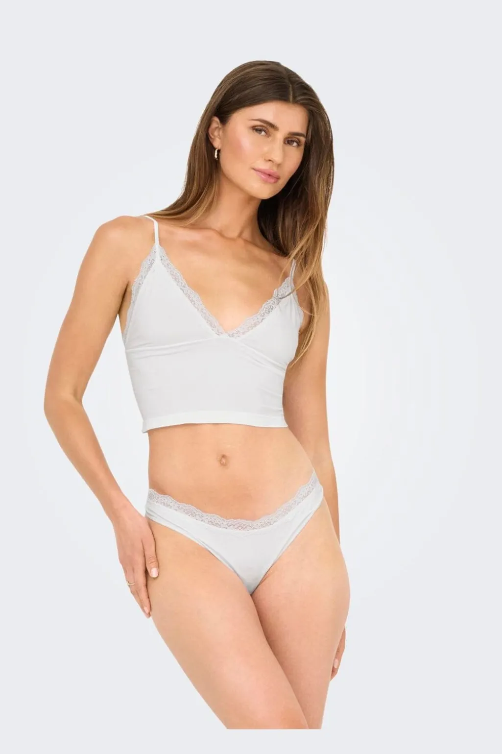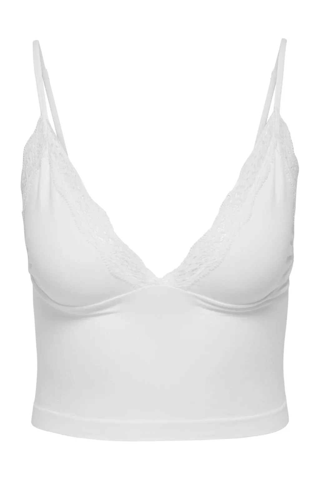 Hvid singlet fra Only med V-udskæring og blondedetaljer. De tynde stropper og den enkle pasform gør den til et praktisk basisstykke i garderoben.