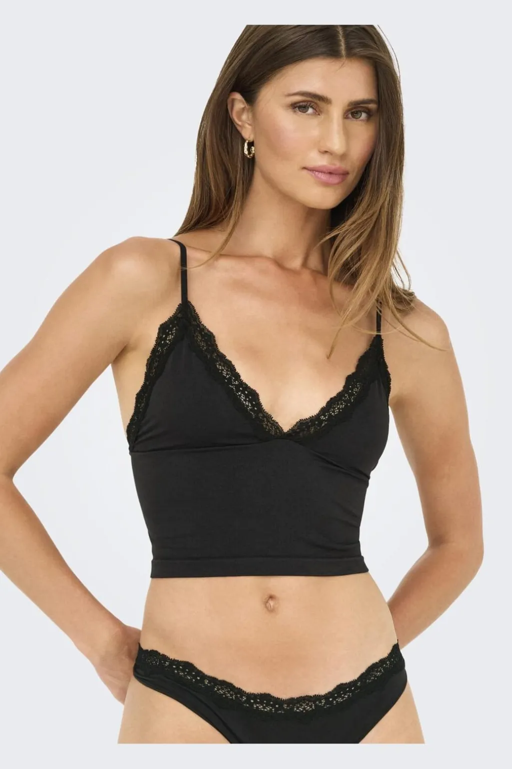 Sort singlet fra Only med V-halsudskæring og blondedetaljer. Toppen har en tætsiddende pasform og smalle stropper, der kan justeres efter behov.