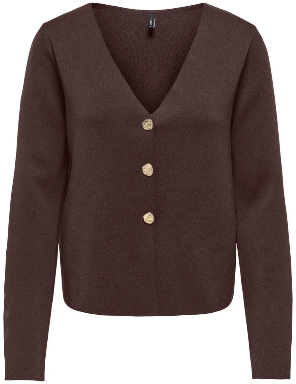 Brun cardigan fra Only med guldknapper. Cardiganen har en V-hals og er fremstillet i en mørkebrun Coffee Bean-nuance med gyldne knapper.