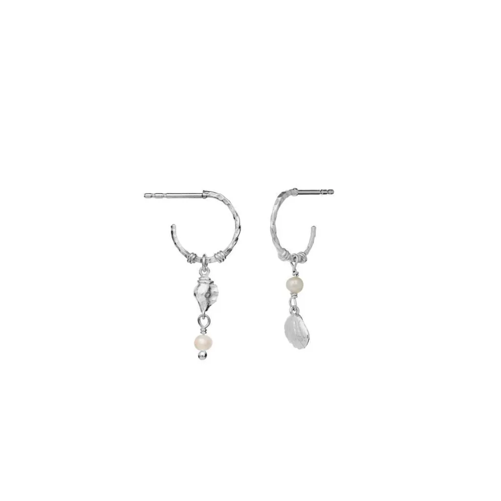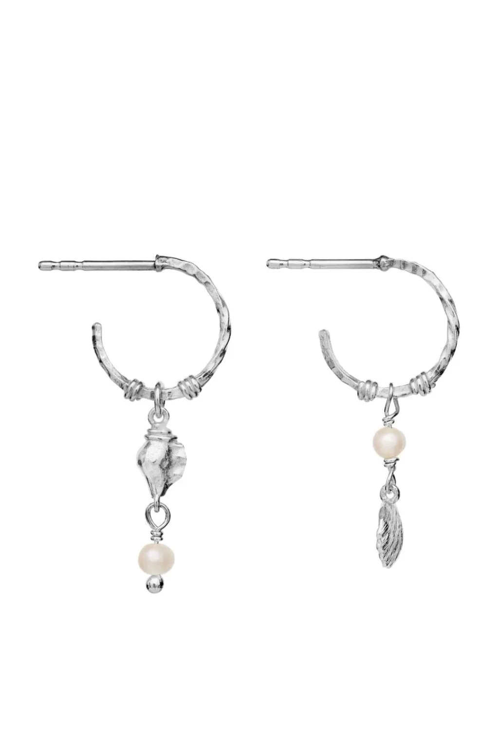 Sølvfarvede hoop-øreringe fra Maanesten med ferskvandsperler. Øreringene har et snoet design med dekorative vedhæng, der giver dem et særpræg.