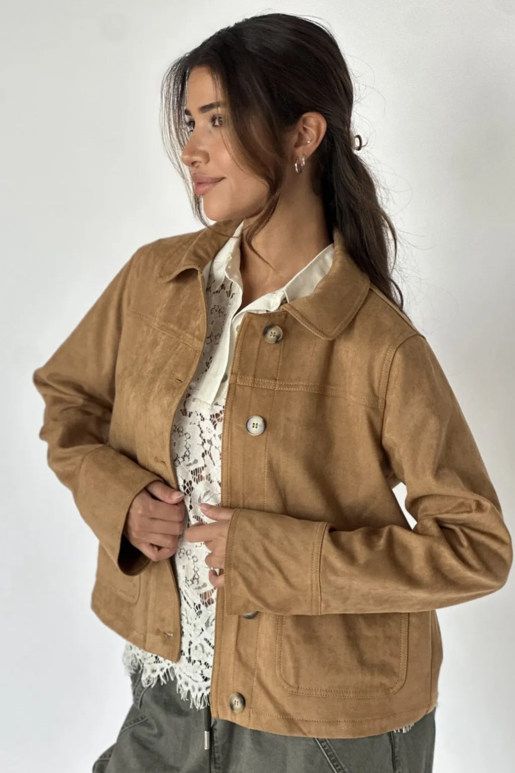 Jakke fra Continue i en varm brun nougat-farve. Jakken har en klassisk krave, knaplukning med store knapper og store forlommer.