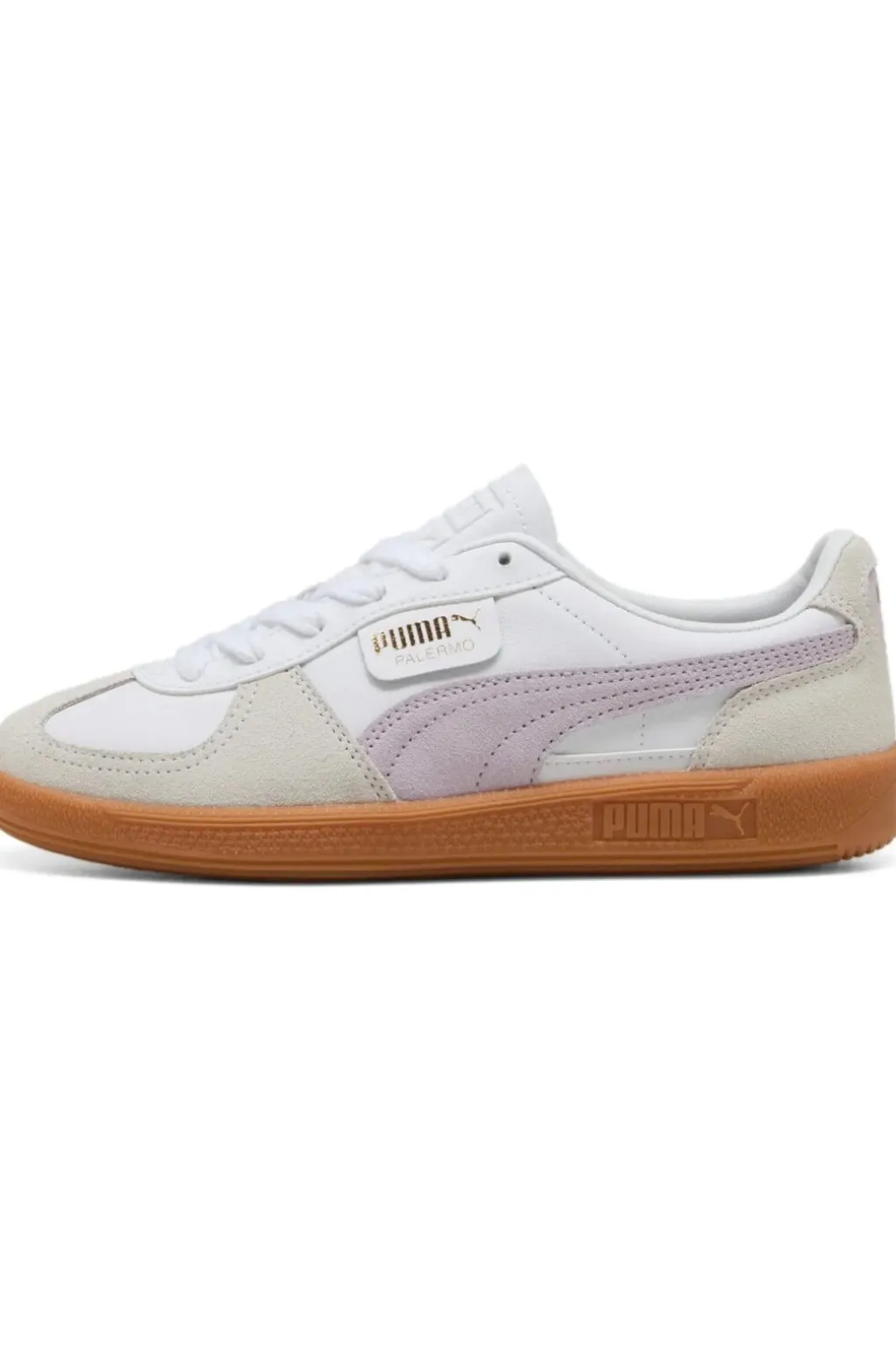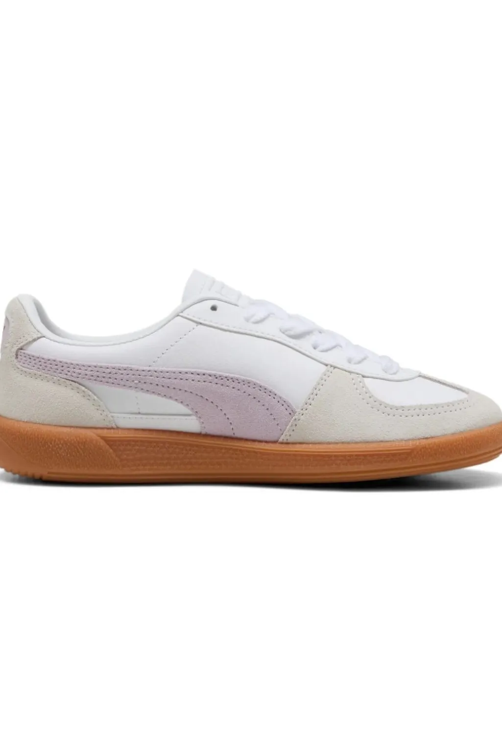 Hvid sneaker fra Puma med lilla og beige detaljer. Sneakeren har en klassisk lav silhuet med rund tå og snørebånd. Den gummierede sål giver et godt greb.