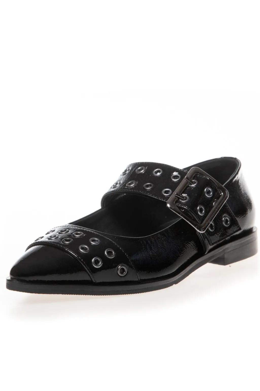Sorte ballerinaer fra Copenhagen Shoes i blankt patentmateriale med spids tå og spænderem. Nitterne på remmen giver skoen et markant udtryk.