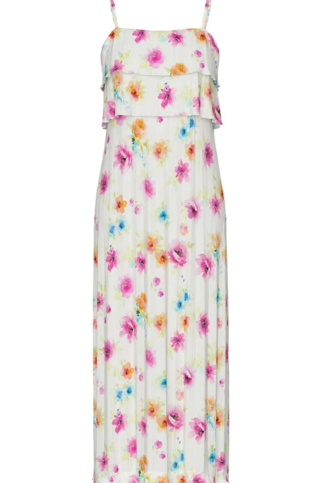 Ankellang kjole fra Pieces med blomstermønster i pink og orange på hvid baggrund. Kjolen har tynde stropper og et lagdelt design med flæser på overdelen.