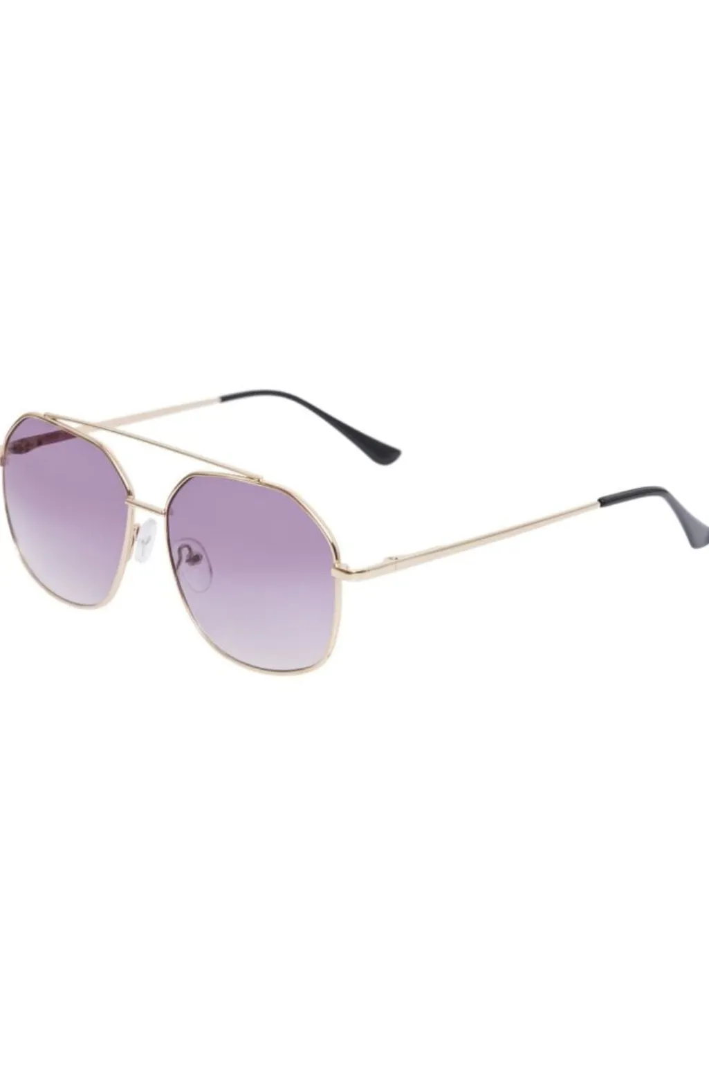 Solbriller fra Pieces med gylden metalramme og lilla gradientlinser. Den ottekantede form giver brillerne et distinkt udtryk. Leveres i en æske.