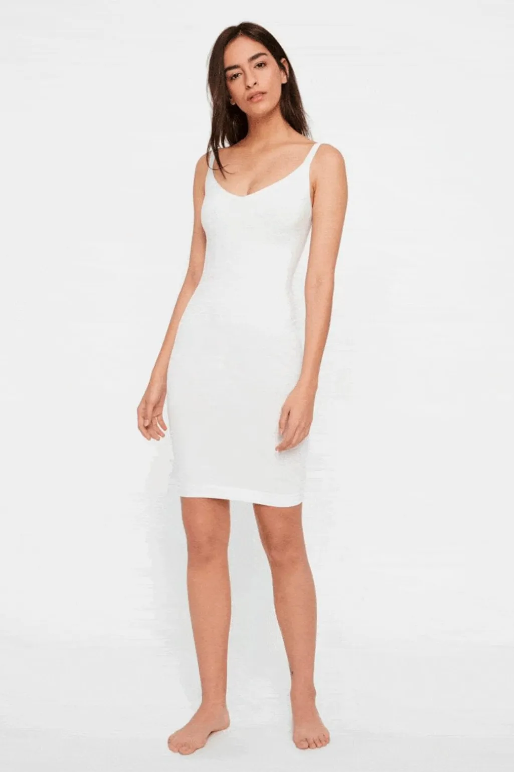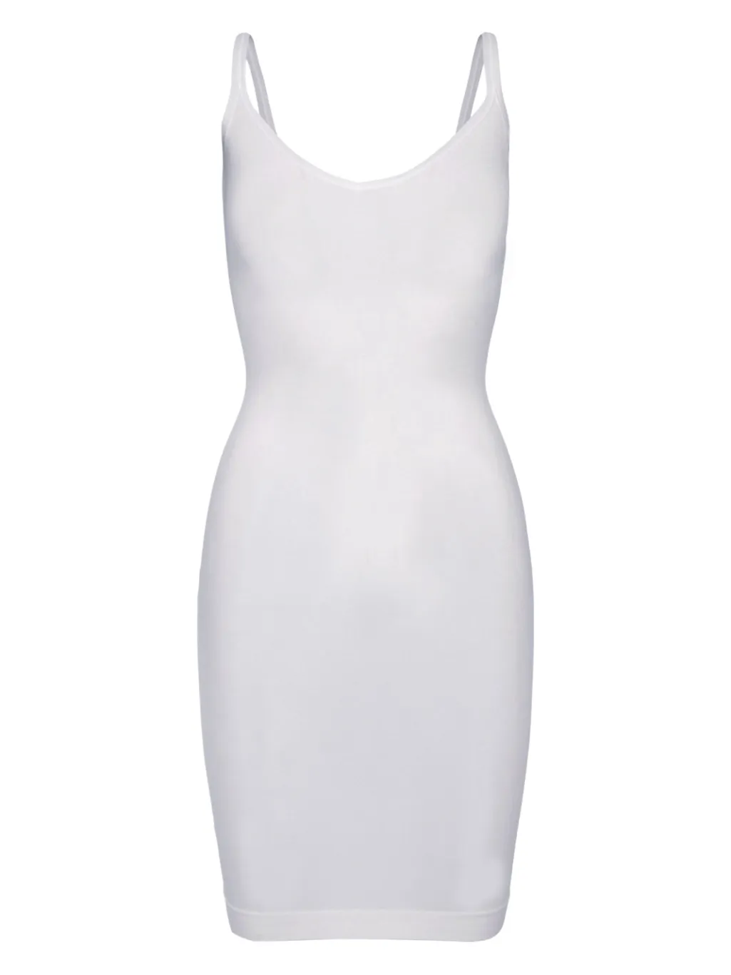 Hvid lang singlet fra Pieces med tynde spaghettistropper og V-udskæring. Den tætsiddende top er fremstillet i strækbart materiale med en lang pasform.