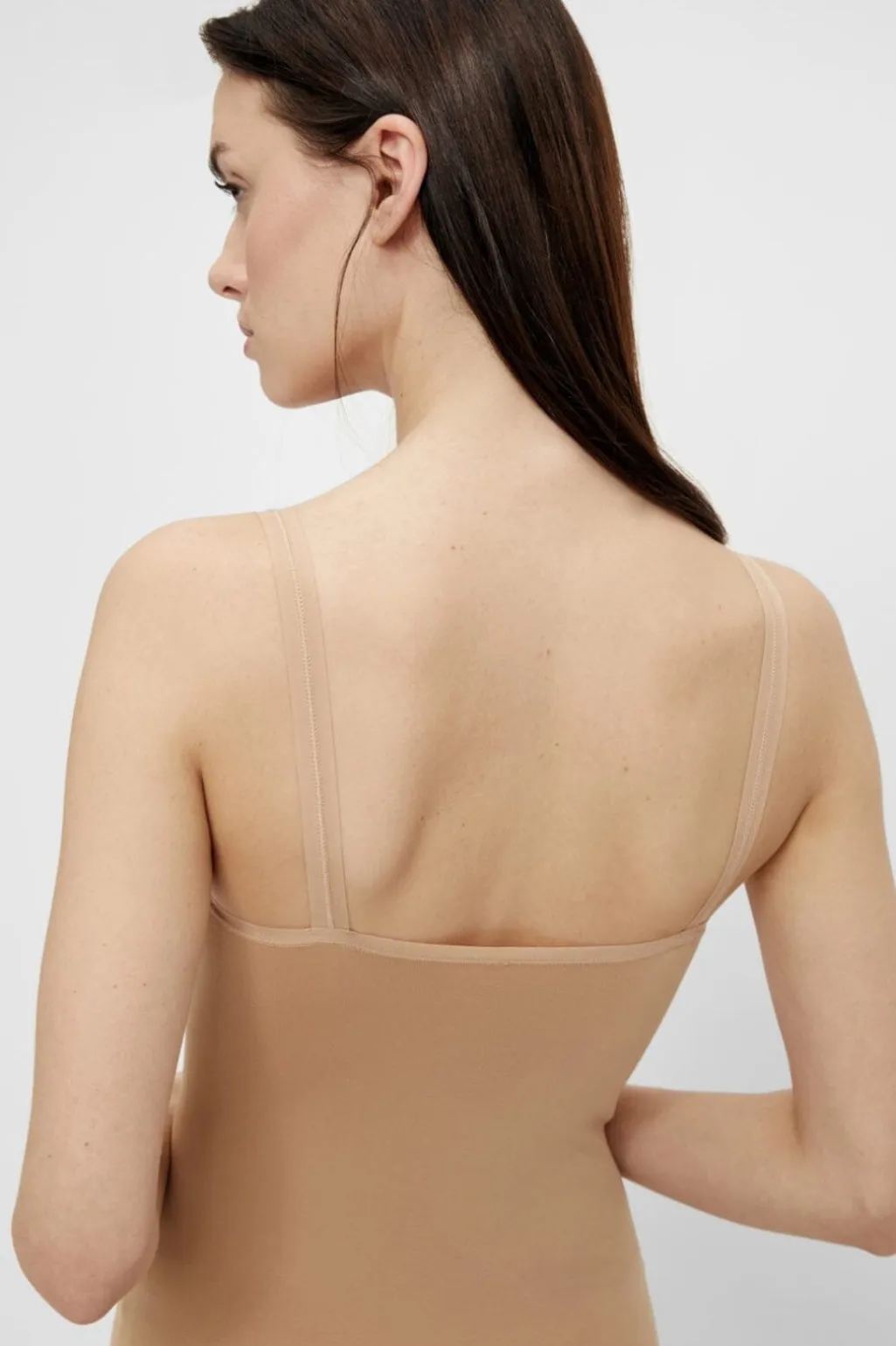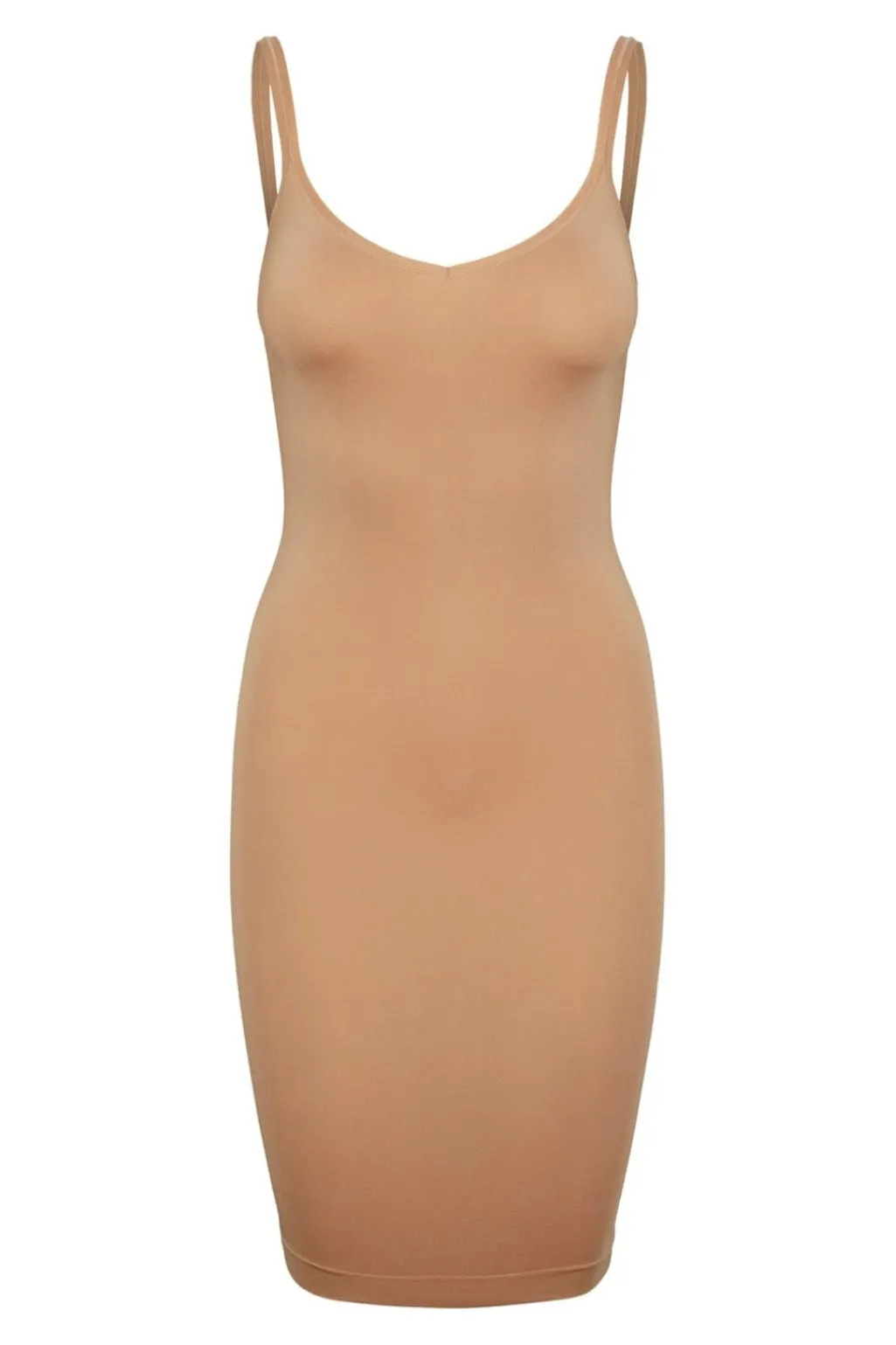 Beige singletkjole fra Pieces i knælængde med V-udskæring. Den tætsiddende kjole har tynde stropper og kan bruges både som underkjole og som selvstændig kjole.