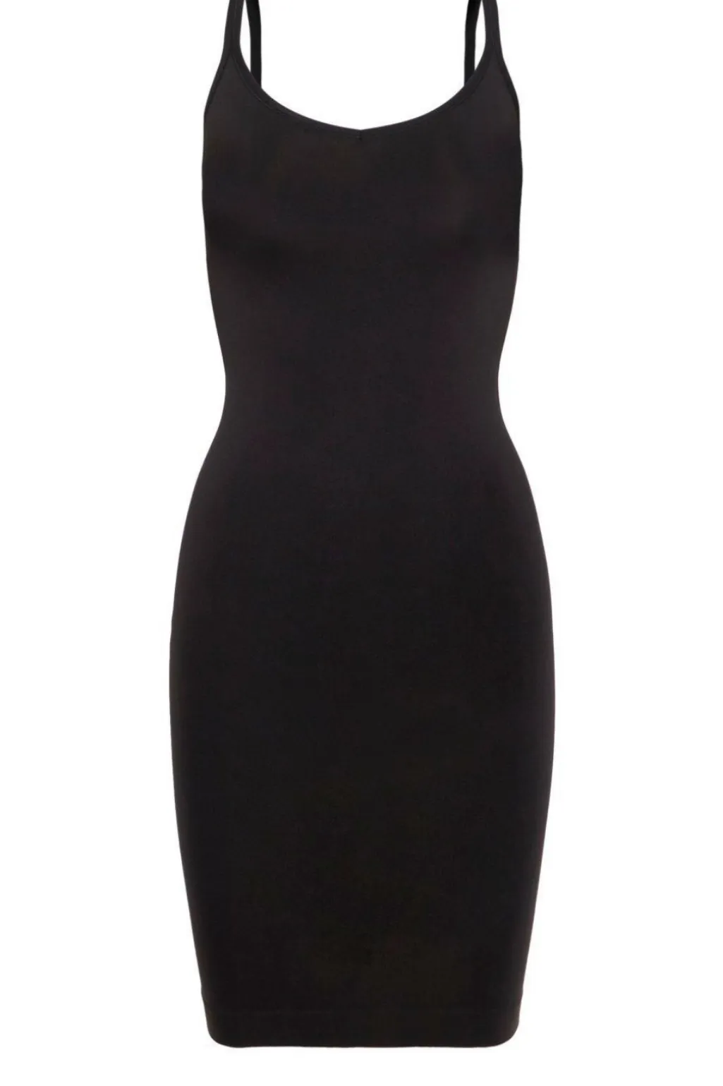 Sort kjole fra Pieces i strækbart materiale. Kjolen har en tætsiddende pasform og kan bruges både som selvstændig kjole og som underkjole under gennemsigtige styles.