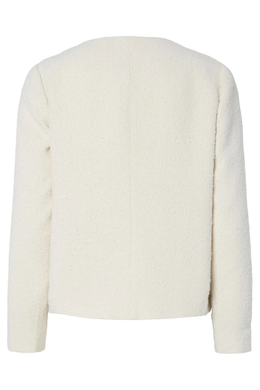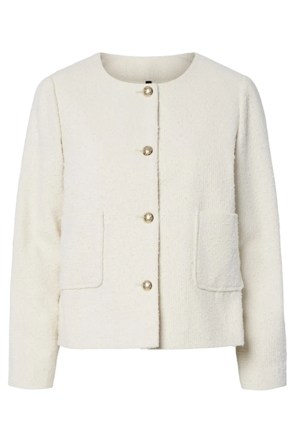 Kort jakke fra Pieces i en cremehvid farve. Den har rund hals, lange ærmer og en kort silhuet med knapper foran. To praktiske lommer på forsiden giver jakken et rent design.