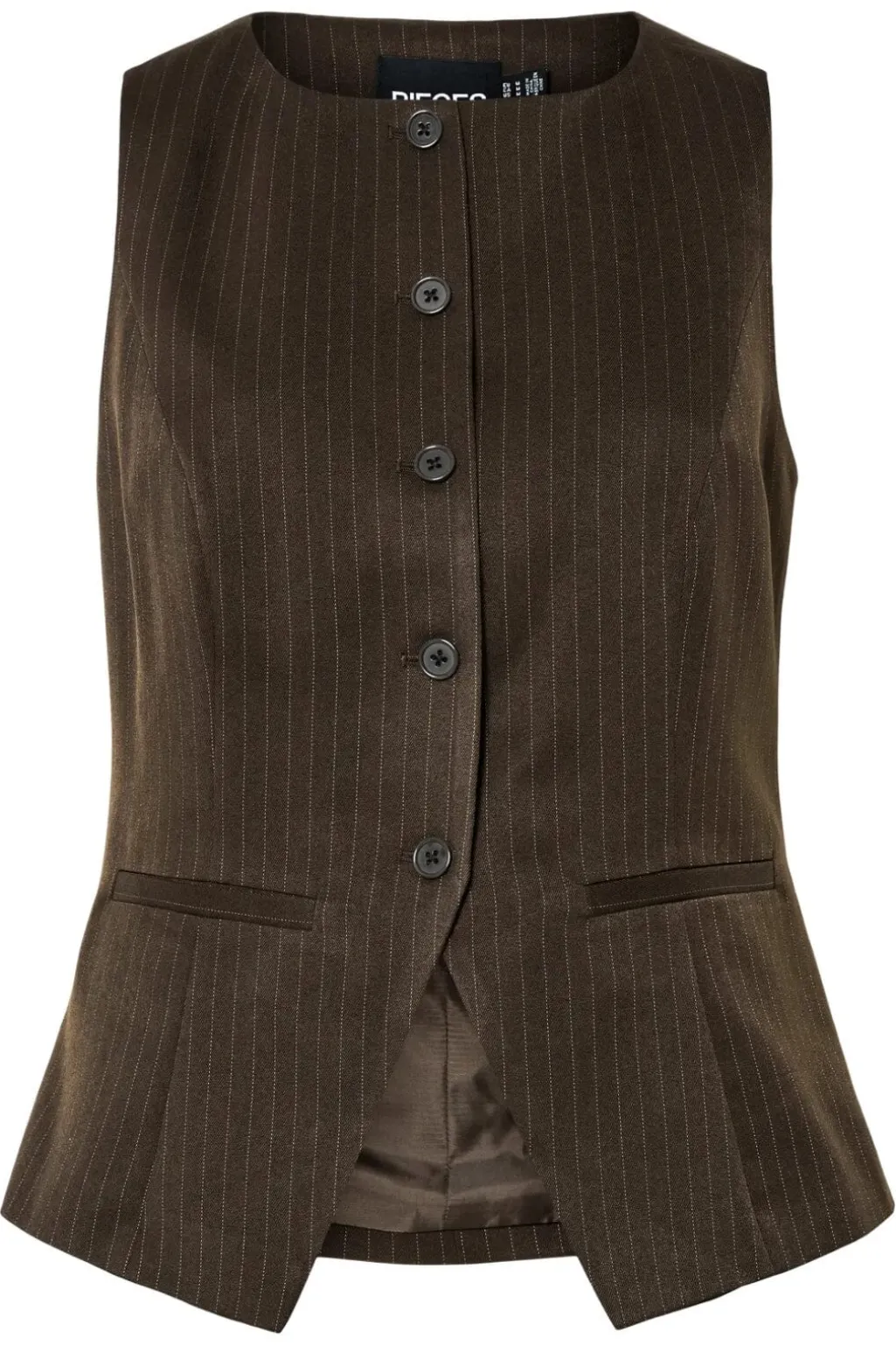Brun pinstripet vest fra Pieces med knaplukning foran. Vesten er lavet af twill med højt trådtal og har en rund halsudskæring. Den har snydelommer og er fuldt foret.
