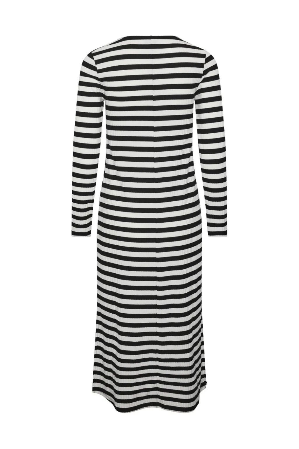 Stribet midi-kjole fra Pieces i jersey-materiale. Sort og hvid med vandrette striber, rund halsudskæring og lange ærmer. Kjolen har en blød og elastisk kvalitet.