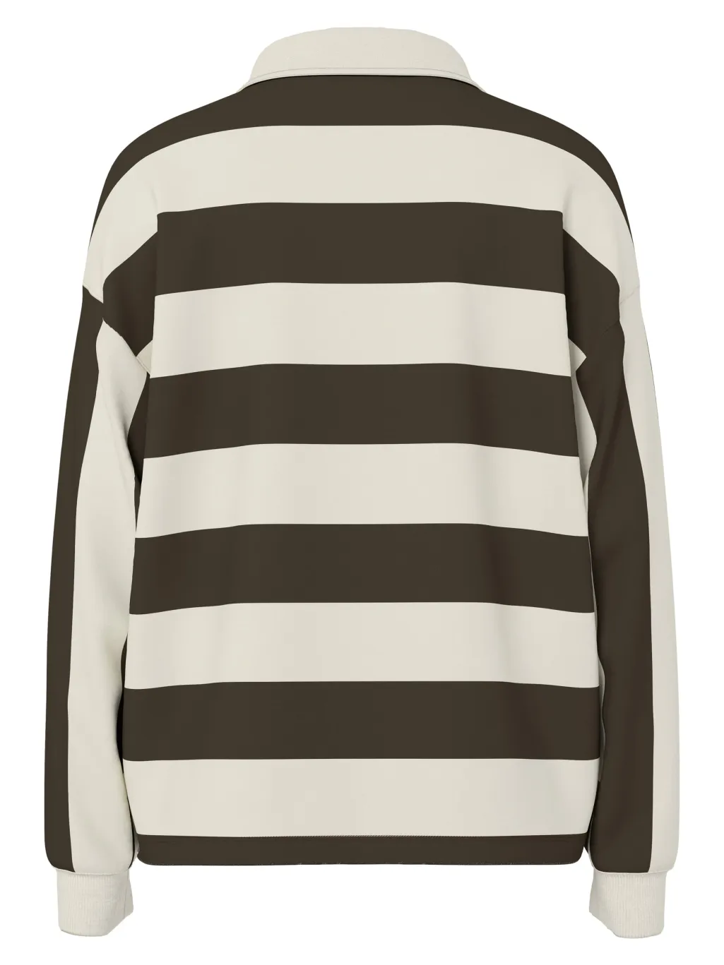 Stribet polo-skjorte fra Pieces i brun og beige. Skjorten har brede horisontale striber og en klassisk polo-krave med knaplukning.