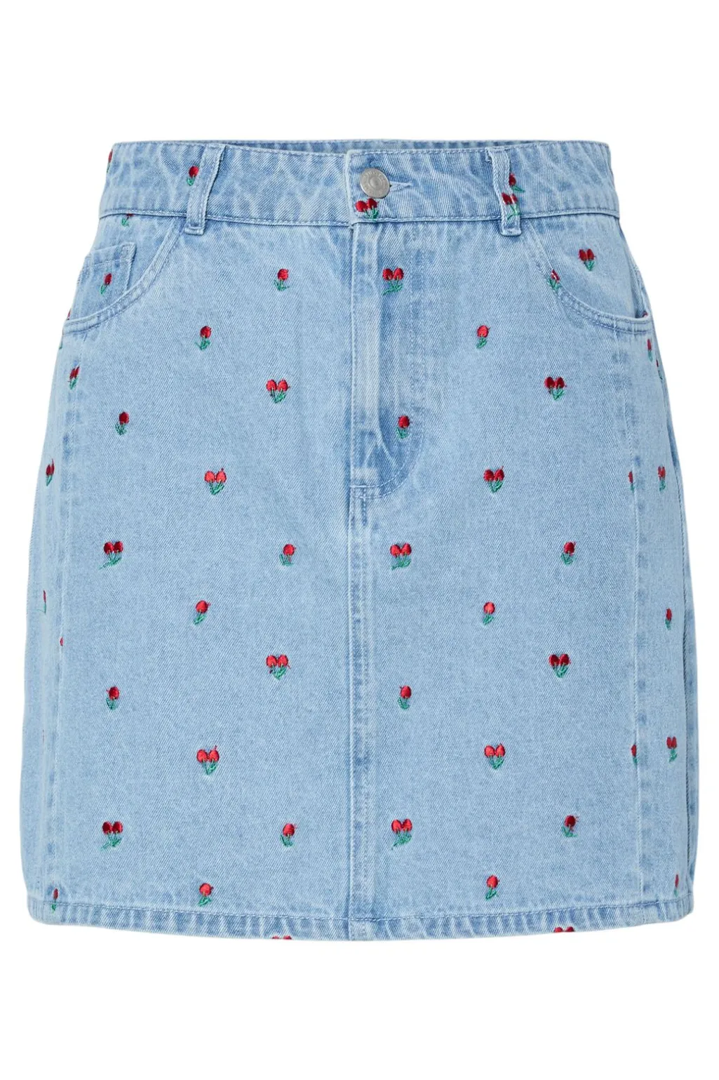 Kort denimnederdel fra Pieces i lys blå med broderede tulipaner. Den ekstra korte nederdel har høj talje og forlommer samt lukning med krogknap og lynlås.
