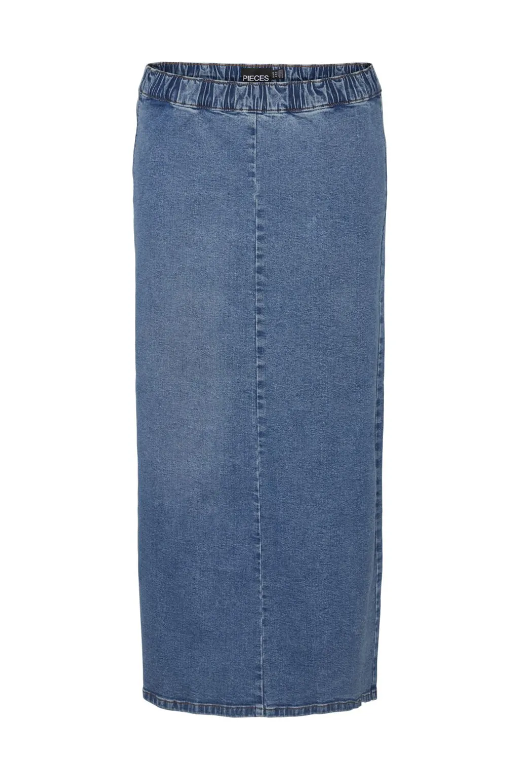 Mellemblå denimnederdel fra Pieces med høj talje og midi-længde. Den lige silhuet kombinerer et enkelt design med praktiske detaljer som lynlås og elastik i taljen.