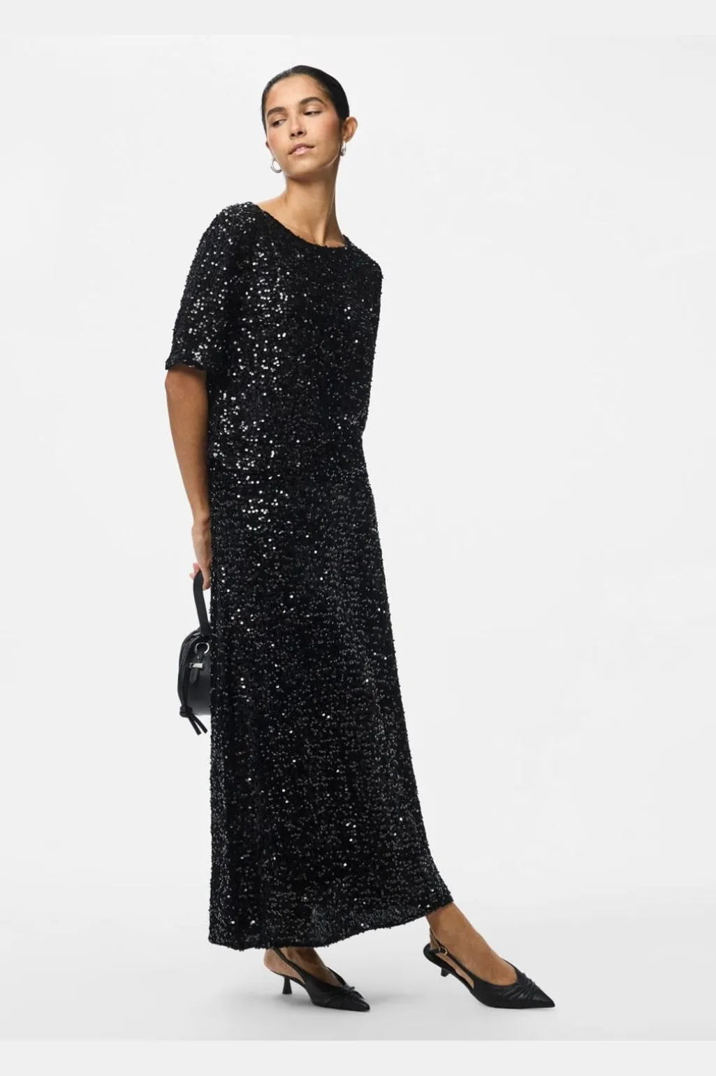 Ankellang nederdel fra Pieces i sort med skinnende palietter. Nederdelen har en ensfarvet sort base med palietter over hele overfladen.
